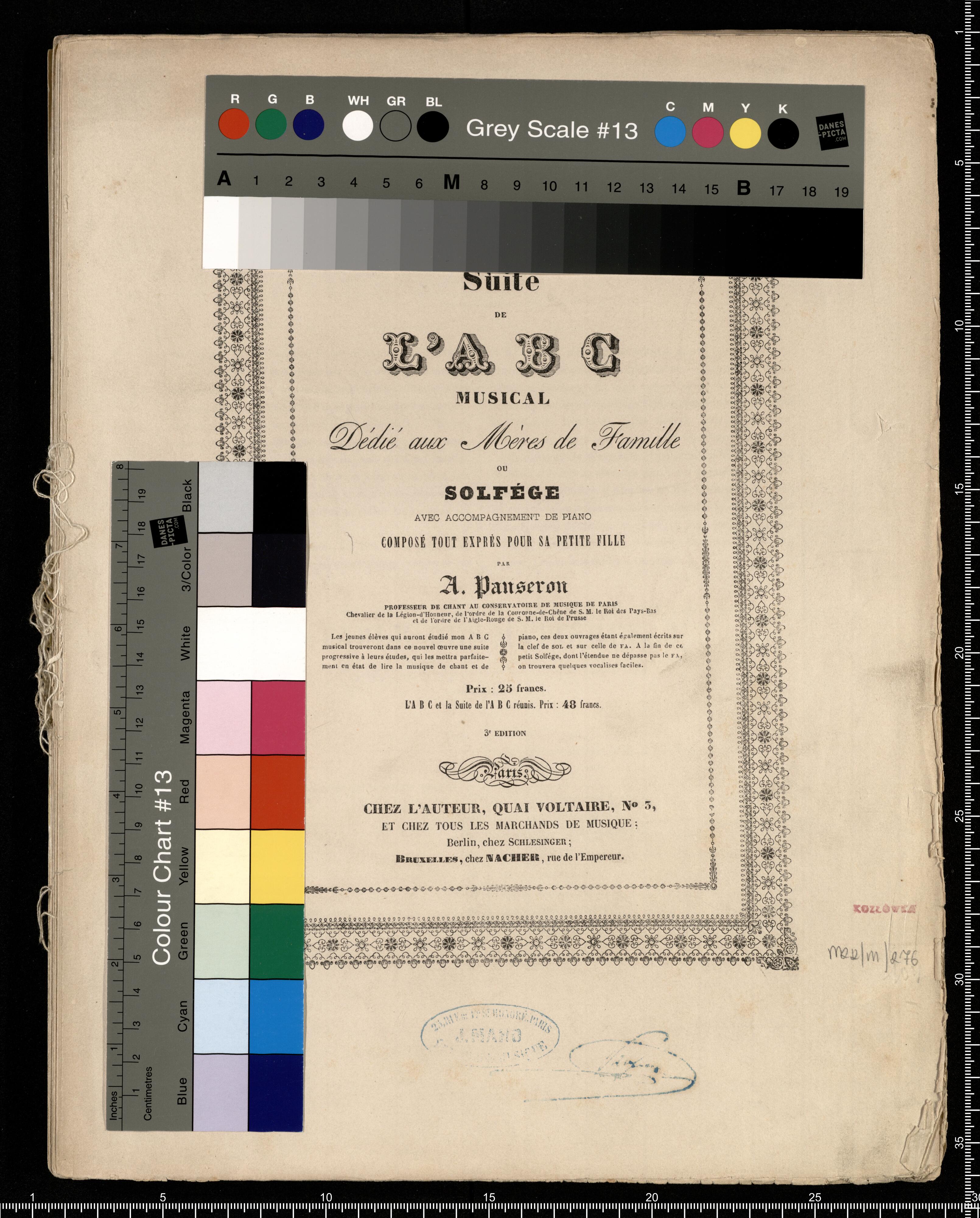 Sùite | DE | L'ABC | MUSICAL | Dédié aux Mères de Famille | OU | SOLFÉGE | AVEC ACCOMPAGNEMENT DE PIANO | COMPOSÉ TOUT EXPRÈS POUR SA PETITE FILLE | PAR | A. Panseron | PROFESSEUR DE CHANT AU CONSERVATOIRE DE MUSIQUE DE PARIS | Chevalier de la Légion-d'Honeur, de l'ordre de la Couronne-deC-Chêne de S. M. le Roi des Pays-Bas | et de l'ordre de l'Aigle-Rouge de S. M. Roi de Prusse | [left column:] Les jeunes élèves qui auront étudié mon ABC | musical trouveront dans ce nouvel œuvre une suite | progressive à leurs études, qui les mettra parfaite- | ment en état de lire la musique de chant et de [right column:] piano, ces deux ouvrages étant également écrits sur | la clef de SOL et sur celle de FA. A la fin de ce | petit Solfége, dont l'entendue ne dépasse pas le FA, | on truvera quelques vocalises faciles. | Prix: 25 francs. | L'ABC et la Suite de l'ABC réunis. Prix: 48 francs. | 3|e EDITION | Paris. | CHEZ L'AUTEUR, QUAI VOLTAIRE, N|o 3, | ET CHEZ TOUS LES MARCHANDS DE MUSIQUE; | Berlin, chez SCHLESINGER; | BRUXELLES, chez NACHER, rue de l'Empereur