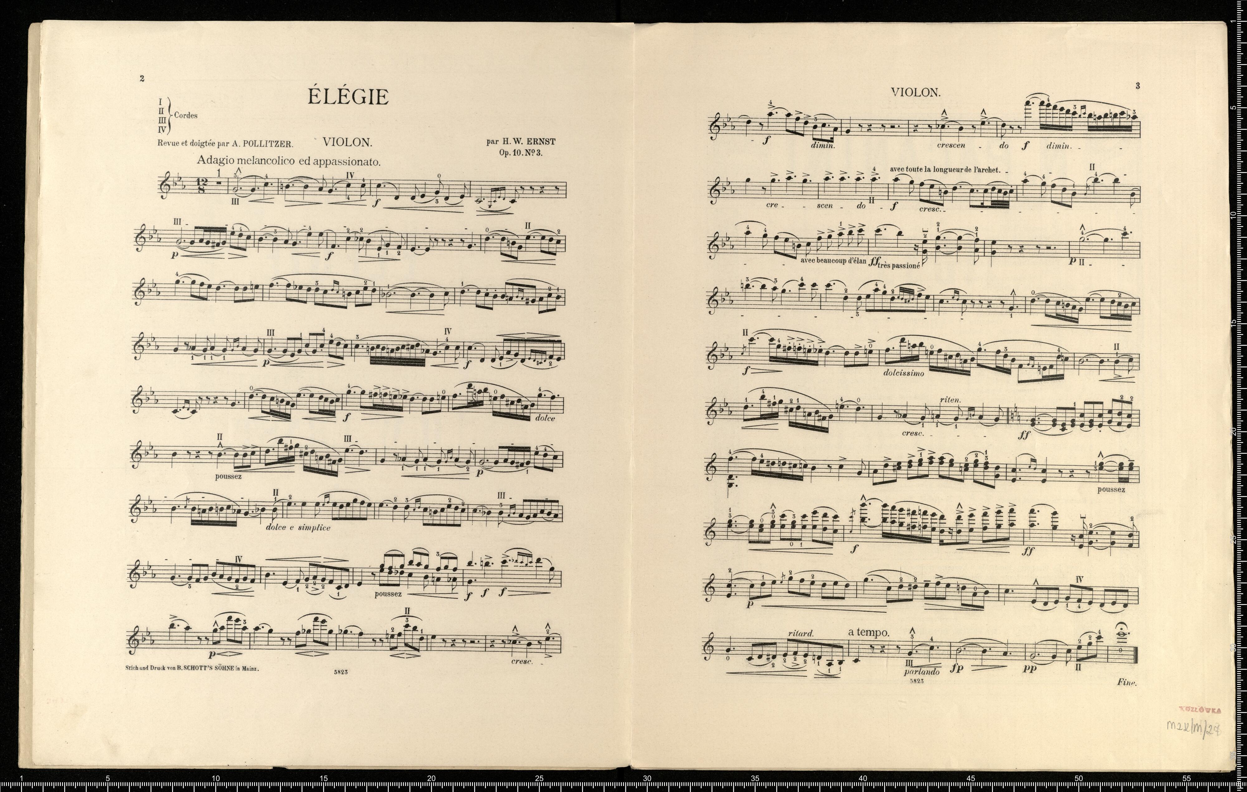 ELEGIE | CHANT | pour | VIOLON | avec accomp. de Piano | par | H. W. ERNST. Op. 10. | N|o 5823. | Arrangement pour Piano à 2 mains par F. Beyer, Op. II9, No. 2. | [left side:] LONDON | SCHOTT & C|O | 157 & 159 Regent Street | BRUXELLES | SCHOTT FRÈRES | Montagne de la Cour [right side:] MAYENCE | B. SCHOTT'S SÖHNE | Weihergarten 5. | PARIS | EDITIONS SCHOTT | Boul|d Malesherbes (40 Rue d'Anjou) | Printed in Germany