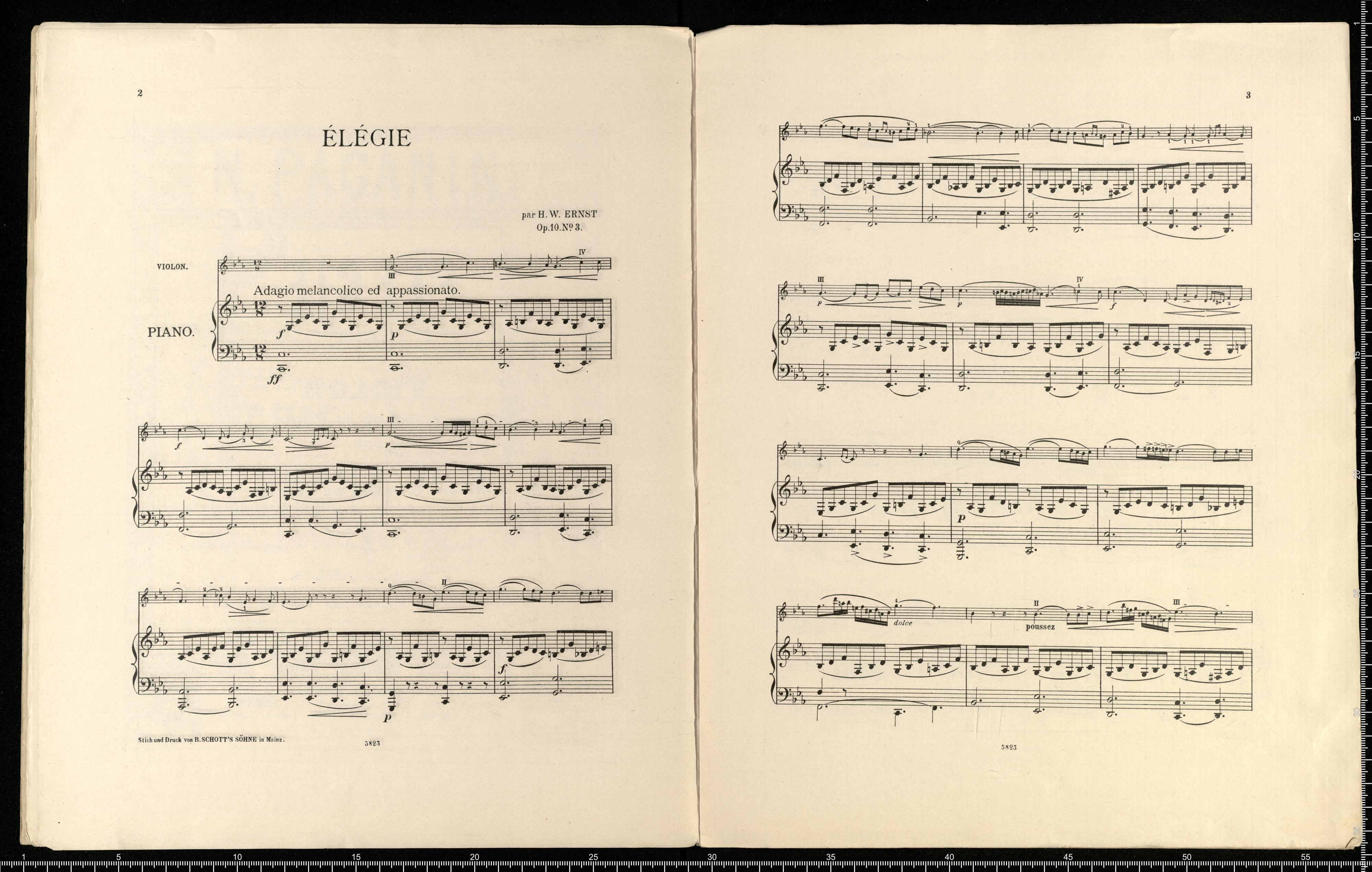 ELEGIE | CHANT | pour | VIOLON | avec accomp. de Piano | par | H. W. ERNST. Op. 10. | N|o 5823. | Arrangement pour Piano à 2 mains par F. Beyer, Op. II9, No. 2. | [left side:] LONDON | SCHOTT & C|O | 157 & 159 Regent Street | BRUXELLES | SCHOTT FRÈRES | Montagne de la Cour [right side:] MAYENCE | B. SCHOTT'S SÖHNE | Weihergarten 5. | PARIS | EDITIONS SCHOTT | Boul|d Malesherbes (40 Rue d'Anjou) | Printed in Germany