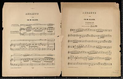 SAMMLUNG | classischer Stücke | aus Werken berühmter Meister. | Für das | Violoncell | mit Begleitung des Pianoforte. [below index of works available in these series along with pricing for each print.] | Complett in einem Bande Pr. 1 Thlr. | Ausgabe für Violino. Ausgabe für Violoncello. | Eigenthum des Verleger. | LEIPZIG, GUSTAV HEINZE, [caption title:] ANDANTE | von | CH. W. GLUCK, Andante vlc, pf F