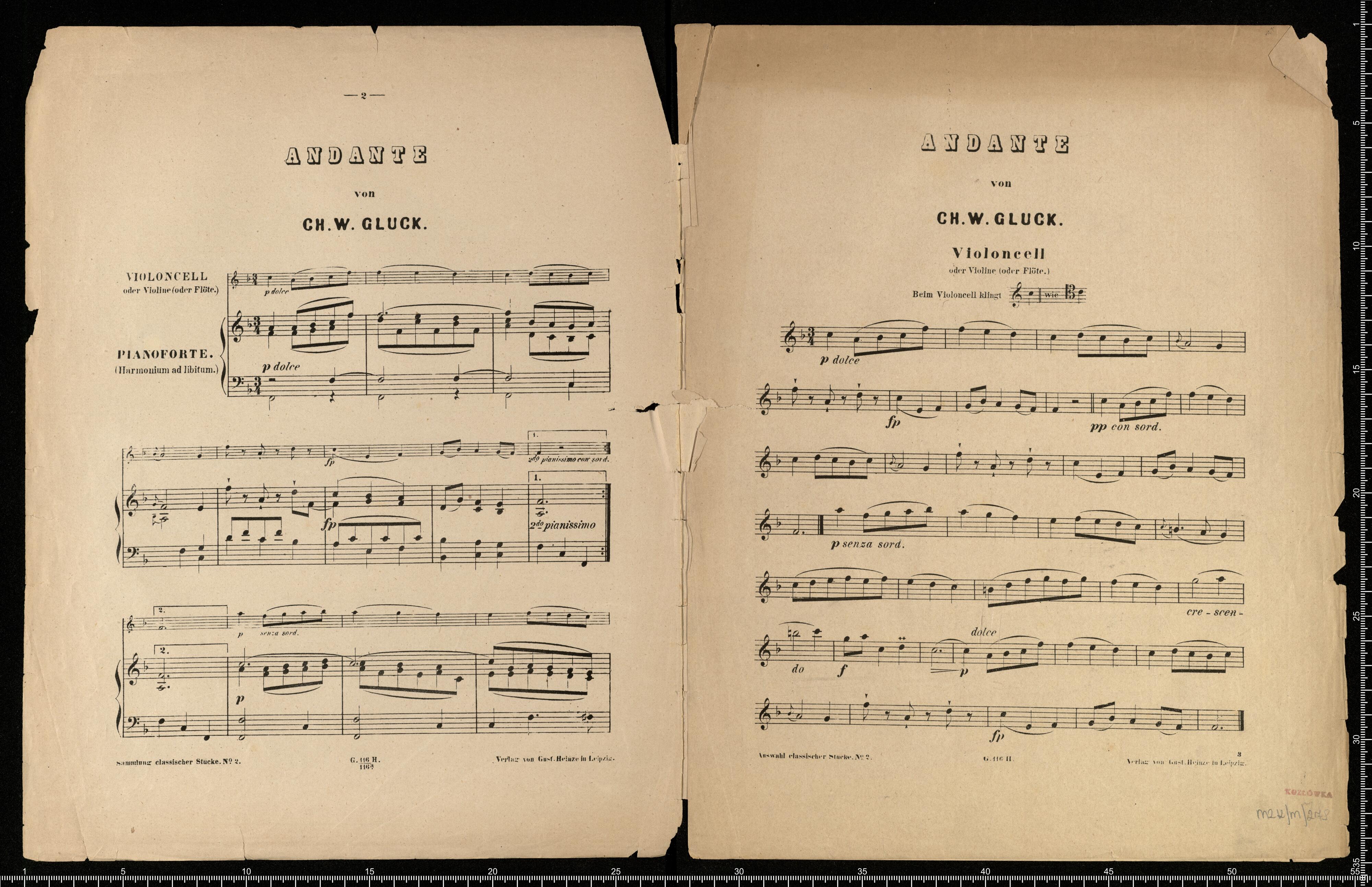 SAMMLUNG | classischer Stücke | aus Werken berühmter Meister. | Für das | Violoncell | mit Begleitung des Pianoforte. [below index of works available in these series along with pricing for each print.] | Complett in einem Bande Pr. 1 Thlr. | Ausgabe für Violino. Ausgabe für Violoncello. | Eigenthum des Verleger. | LEIPZIG, GUSTAV HEINZE
