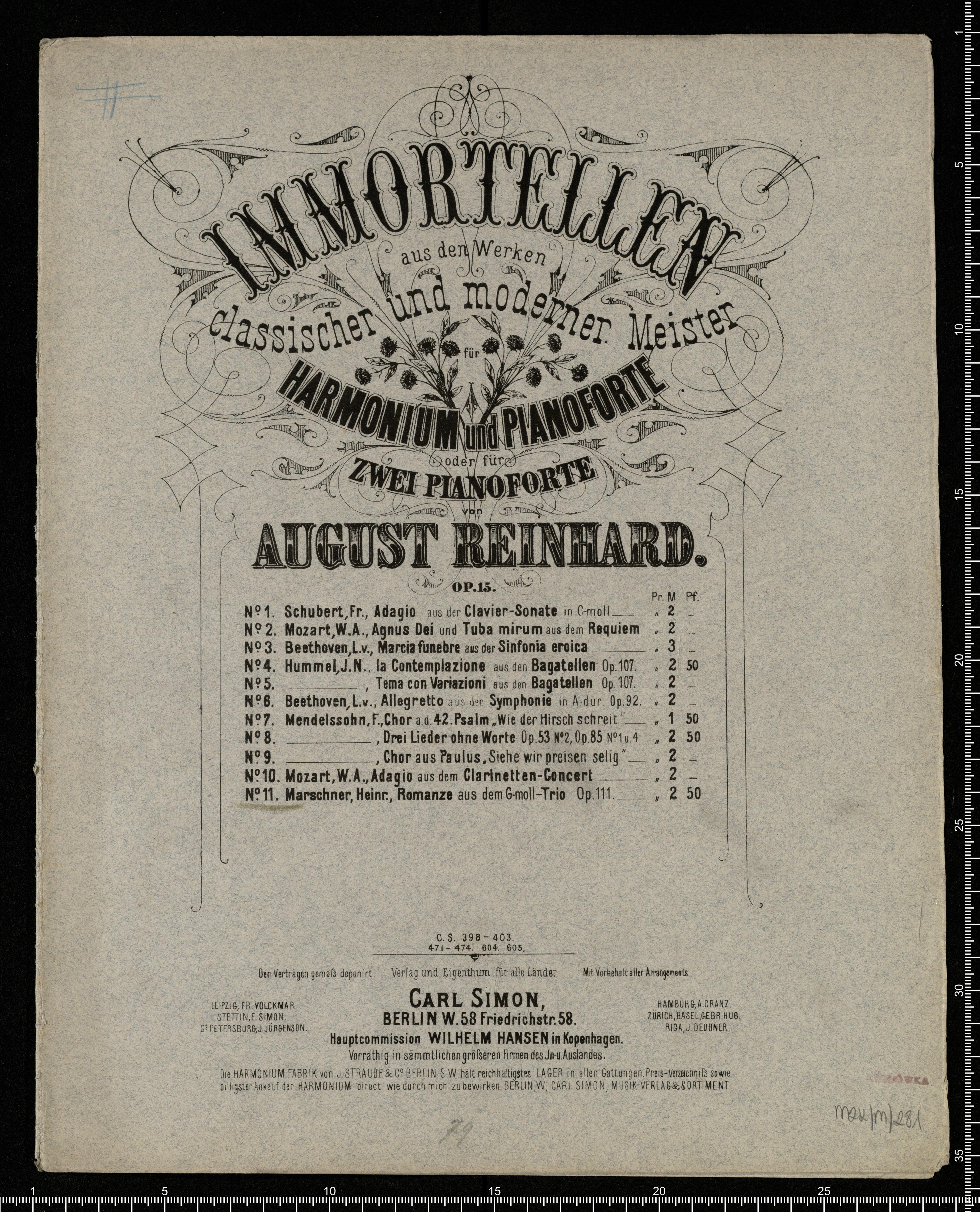 IMMORTELLEN | aus den Werken | classischer und moderner. Meister | für | HARMONIUM und PIANOFORTE | oder für | ZWEI PIANOFORTE | von | AUGUST REINHARD. | Op 15 [below index of works available at stock along with pricing.] | C. S. 398 - 403. | 471 - 474. 604. 605. | Den Verträgen gemäss deponirt. Verlag und Eigenthum für alle Länder Mit Vorbehalt aller Arrangements | [left side:] LEIPZIG, FR. VOLCKMAR. | STETTIN, E. SIMON. | S|t PETERSGURG. J. JÜRGENSON. [center:] CARL SIMON | BERLIN W. 58 Friedrichstr. 58. | Hauptcommision WILHELM HANSEN in Kopenhagen. [right side:] HAMBURG, A. CRANZ. | ZÜRICH, BASEL, GEBR. HUG. | RIGA, J. DEUBNER. | [below:] Die HARMONIUM-FABRIL von J. STRAUBE & C|o BERLIN, S. W. hält reichhaltigstes LAGER in allen Gattungen. Preis-Verzeichniss sowie | billingster Ankauf der HARMONIUM direct wie durch mich zu bewirken. BERLIN, W, CARL SIMON, MUSIK-VERLAG & SORTIMENT