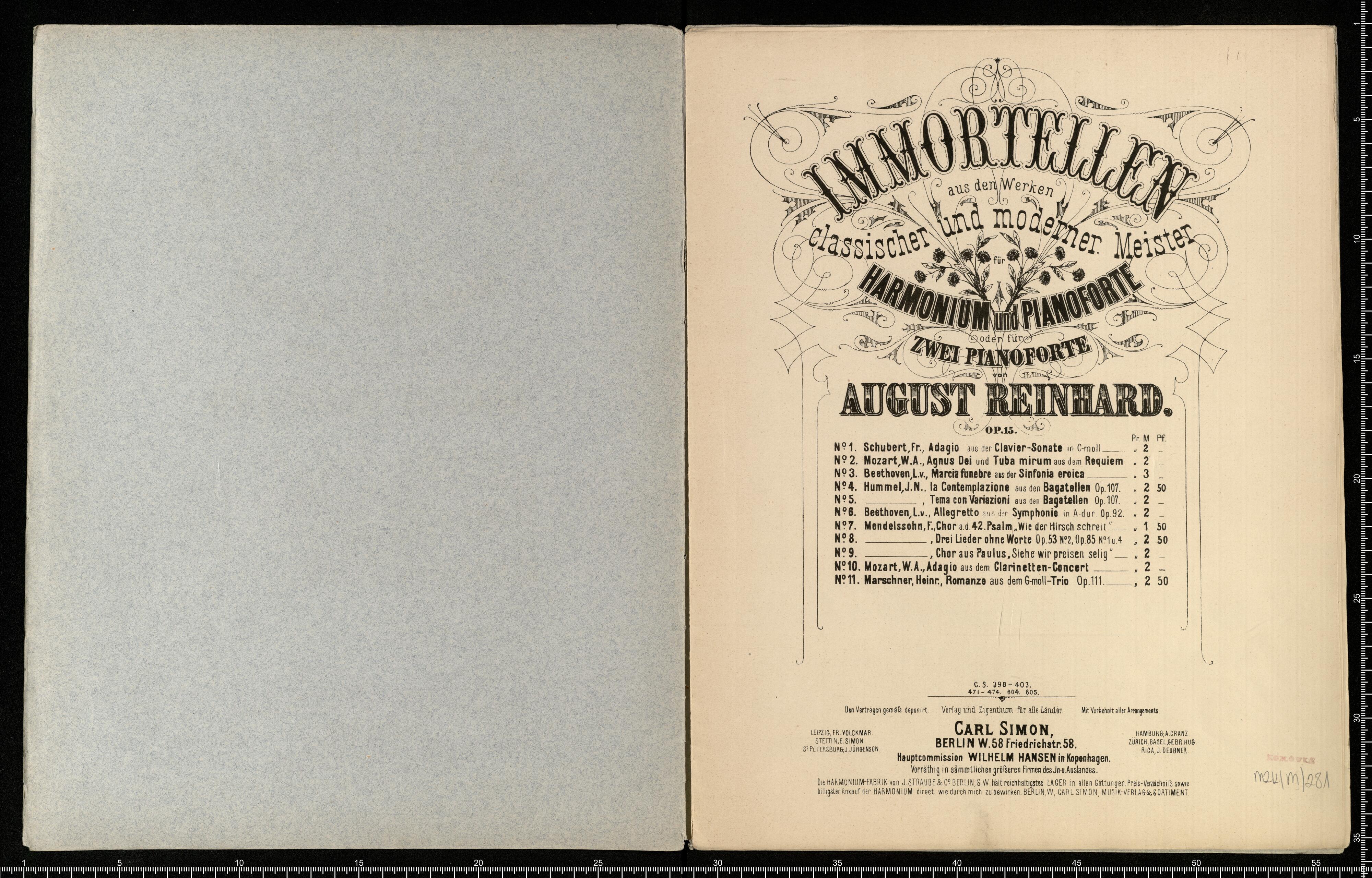 IMMORTELLEN | aus den Werken | classischer und moderner. Meister | für | HARMONIUM und PIANOFORTE | oder für | ZWEI PIANOFORTE | von | AUGUST REINHARD. | Op 15 [below index of works available at stock along with pricing.] | C. S. 398 - 403. | 471 - 474. 604. 605. | Den Verträgen gemäss deponirt. Verlag und Eigenthum für alle Länder Mit Vorbehalt aller Arrangements | [left side:] LEIPZIG, FR. VOLCKMAR. | STETTIN, E. SIMON. | S|t PETERSGURG. J. JÜRGENSON. [center:] CARL SIMON | BERLIN W. 58 Friedrichstr. 58. | Hauptcommision WILHELM HANSEN in Kopenhagen. [right side:] HAMBURG, A. CRANZ. | ZÜRICH, BASEL, GEBR. HUG. | RIGA, J. DEUBNER. | [below:] Die HARMONIUM-FABRIL von J. STRAUBE & C|o BERLIN, S. W. hält reichhaltigstes LAGER in allen Gattungen. Preis-Verzeichniss sowie | billingster Ankauf der HARMONIUM direct wie durch mich zu bewirken. BERLIN, W, CARL SIMON, MUSIK-VERLAG & SORTIMENT