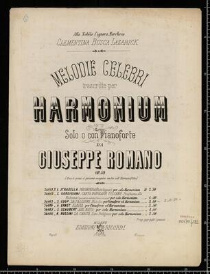 Alla Nobile Signora Marchesa | Clementina Busca Lazarick | MELODIE CELEBRI | transcrite per | HARMONIUM | Solo o on Pianoforte | DA | GIUSEPPE ROMANO | OP. 59 | (Questi pezzi si possono eseguire anche sull'Harmoniflûte) [below index of other available transcribed works with its pricing.] Prop. per tutti i paesi | MILANO | EDIZIONI RICORDI | ROMA | Napoli LONDRA Firenze, [caption title:] LA PASSIONE, Melodie celebri harmonium, pf B