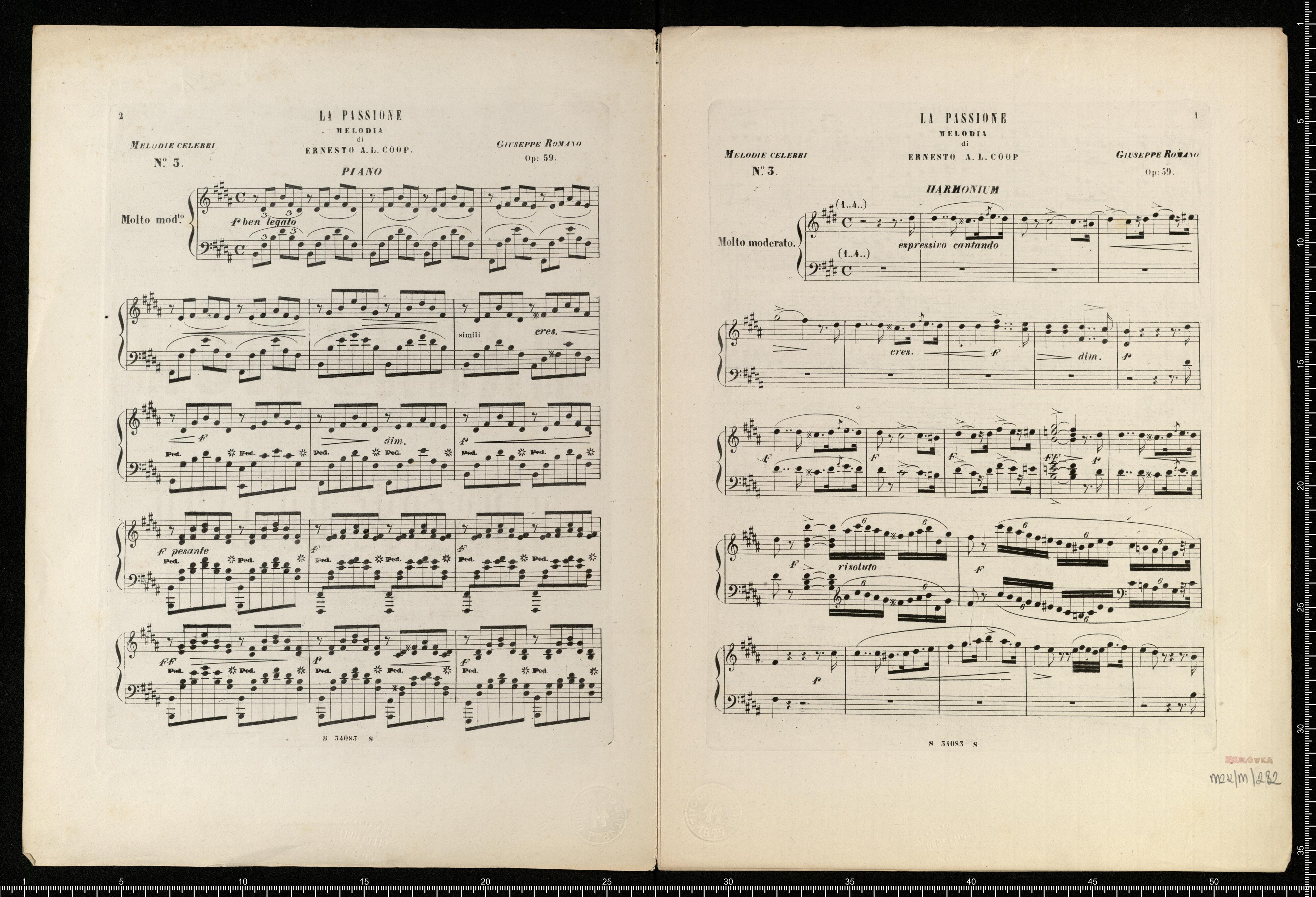 Alla Nobile Signora Marchesa | Clementina Busca Lazarick | MELODIE CELEBRI | transcrite per | HARMONIUM | Solo o on Pianoforte | DA | GIUSEPPE ROMANO | OP. 59 | (Questi pezzi si possono eseguire anche sull'Harmoniflûte) [below index of other available transcribed works with its pricing.] Prop. per tutti i paesi | MILANO | EDIZIONI RICORDI | ROMA | Napoli LONDRA Firenze