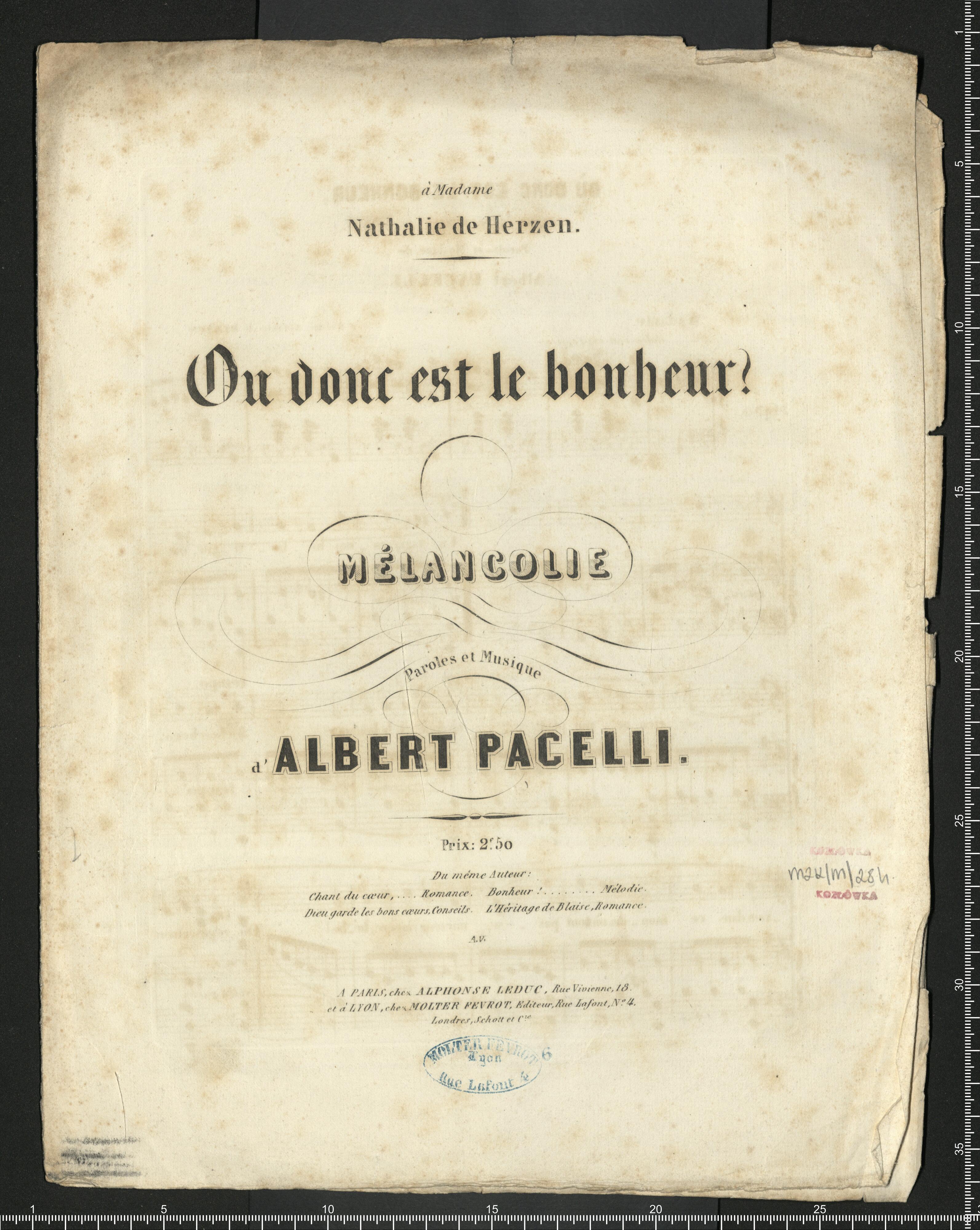 à Madame | Nathalie de Herzen. | Ou donc est le bonheur? | MÉLANCOLIE | Paroles et Musique | d'ALBERT PACELLI. | Prix 2|F 50 | Du même Auteur: Chant du cœur,... Romance. Bonheur!... Mélodie. | Dieu garde les bons cœur, Conseils. L'Héritage de Blaise, Romance. | A.V. | A PARIS, chez ALPHONS LEDUC, Rue Vivienne, 18. | et à LYON, chez MOLTER FEVROT, Editeur, Rue Lafont, N|o 4. | Londres, Schott et C|i|e
