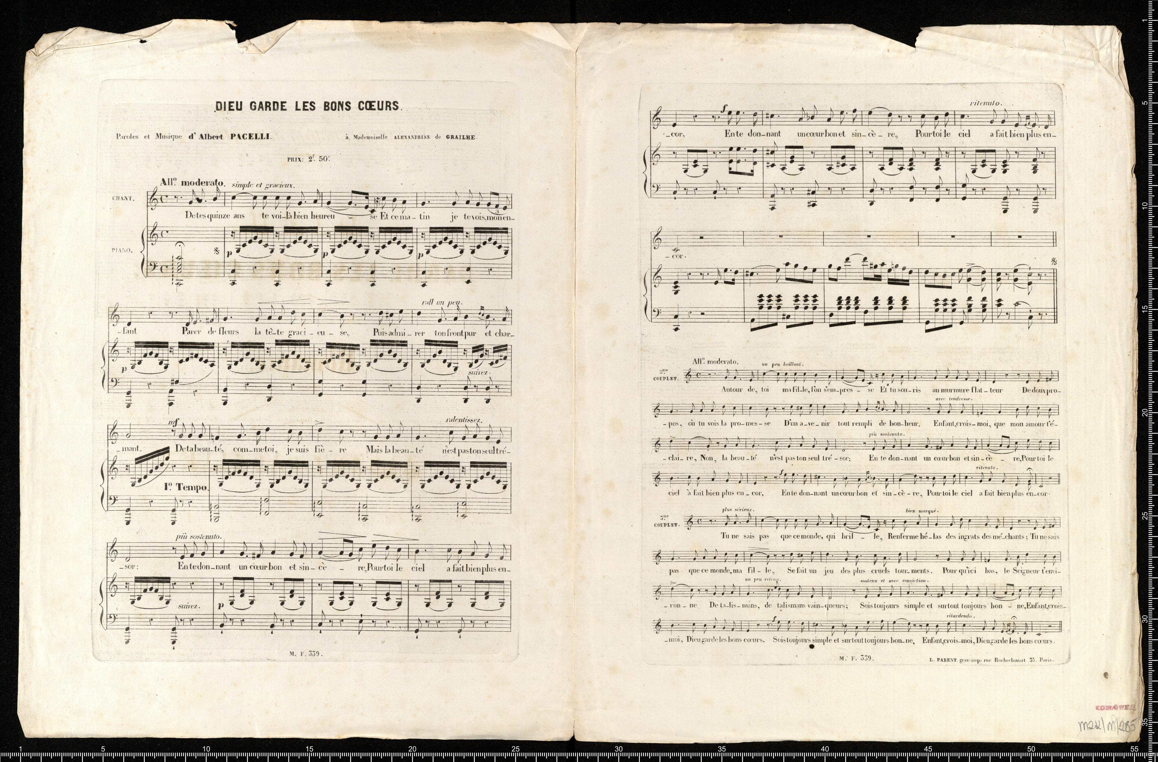 à M|l|l|e Alexandrine de Grailhe. | DIEU | GARDE LES BONS CŒURS, Romance, Paroles et Musique | DE | ALBERT PACELLI. | A.V. | Prix: 2|f 50 | PARIS, chez ALPHONS LEDUC, Rue Vivienne, 18. | et à LYON, chez MOLTER FEVROT, Editeur, Rue Lafont, N|o 4. | Londres, Schott et C|i|e Propriété des Editeurs