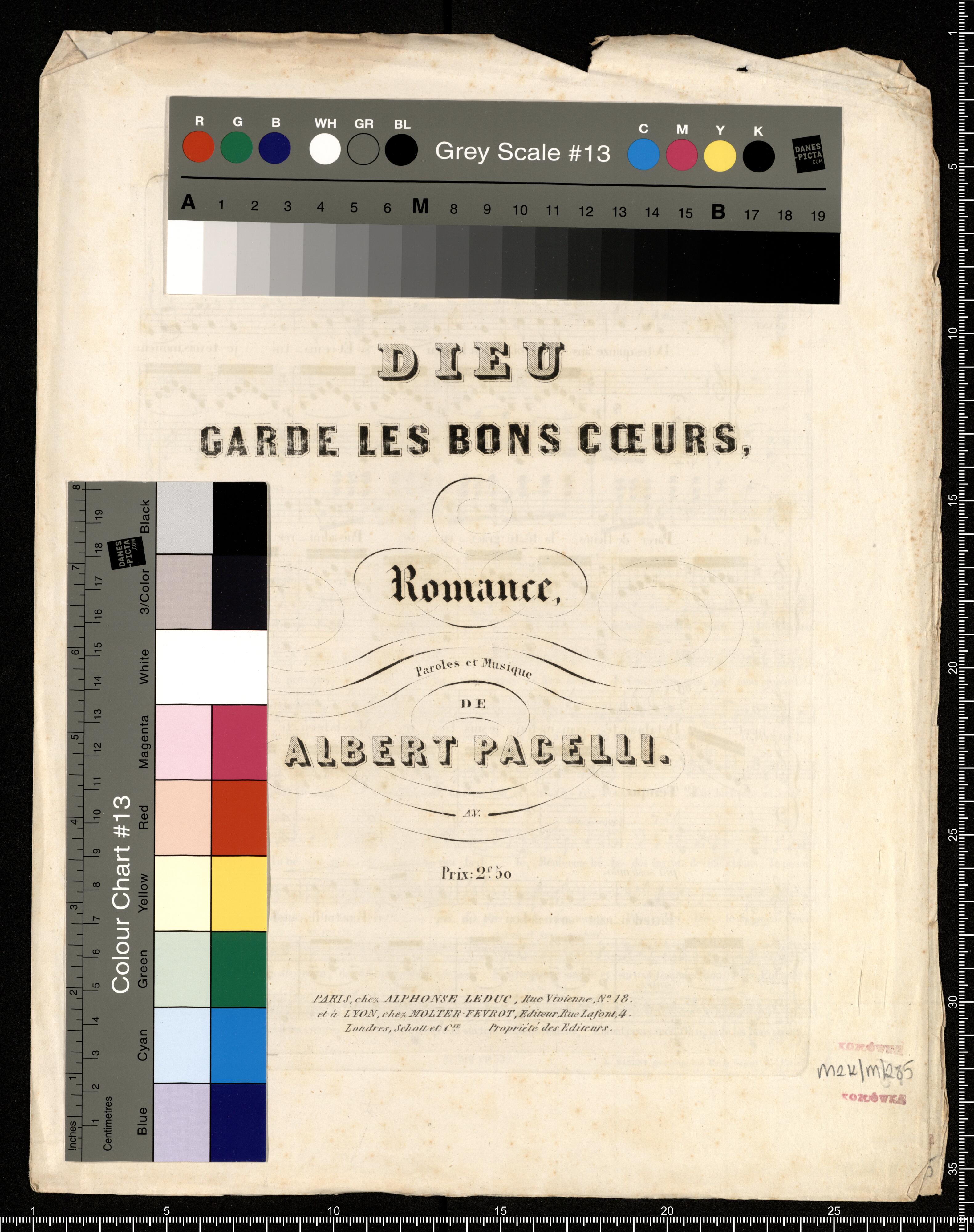 à M|l|l|e Alexandrine de Grailhe. | DIEU | GARDE LES BONS CŒURS, Romance, Paroles et Musique | DE | ALBERT PACELLI. | A.V. | Prix: 2|f 50 | PARIS, chez ALPHONS LEDUC, Rue Vivienne, 18. | et à LYON, chez MOLTER FEVROT, Editeur, Rue Lafont, N|o 4. | Londres, Schott et C|i|e Propriété des Editeurs