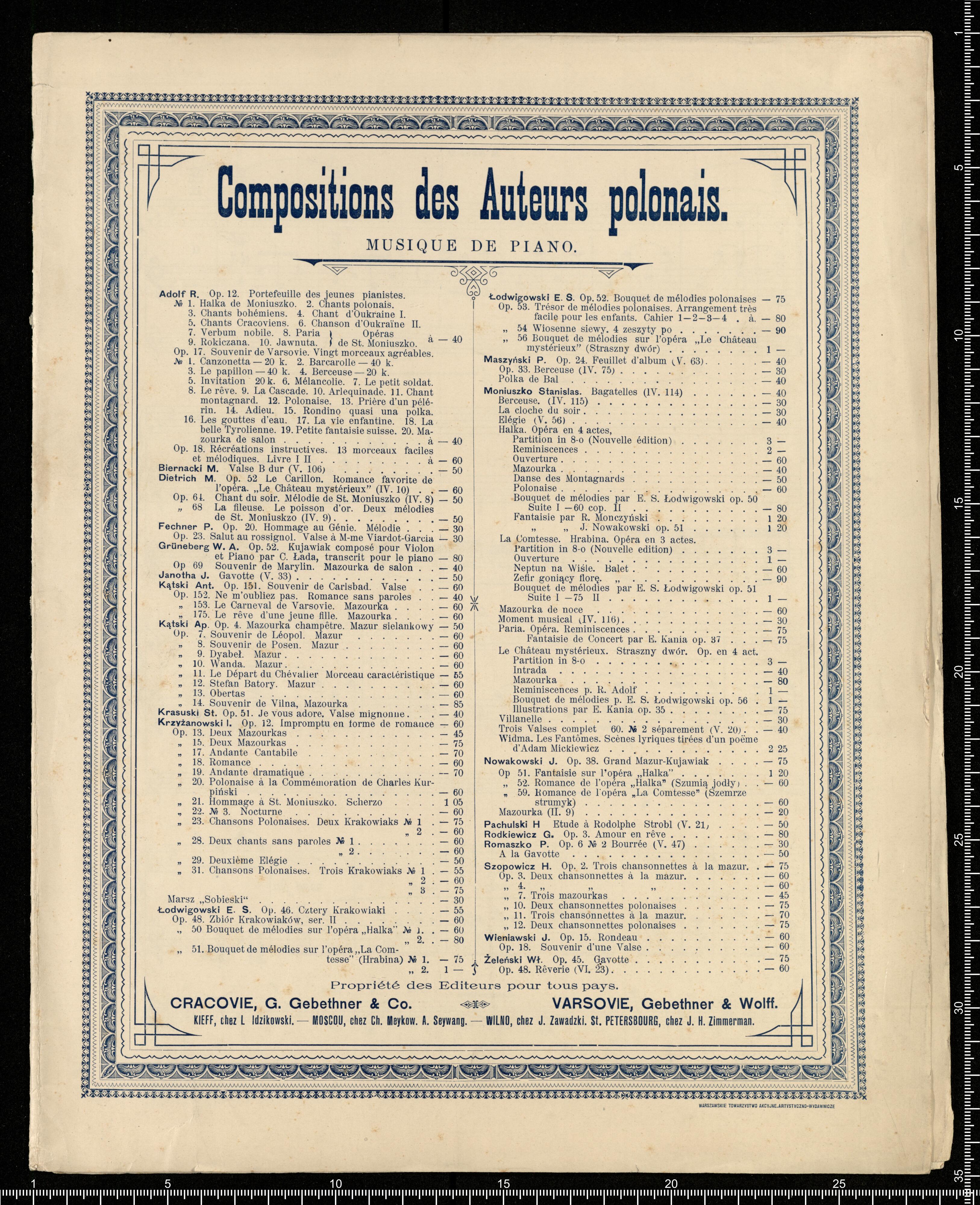 Les Perles du Violiniste. | CHOIX DE COMPOSITIONS | pour Violon | avec accomagnement de Piano revues et doigtées | PAR | MAURICE ROSEN. | [price list] | VARSOVIE, GEBETHNER & WOLFF | St. PETERSBURG chez J. H. Zimmermann. | MOSCOU chez Ch. Meykow. | KIEFF chez L. Idzikowski. WILNO chez V. Makowski. | WARSZAWSKIE AKC. T-STWO ARTYSTYCZNO WYDAWNICZE