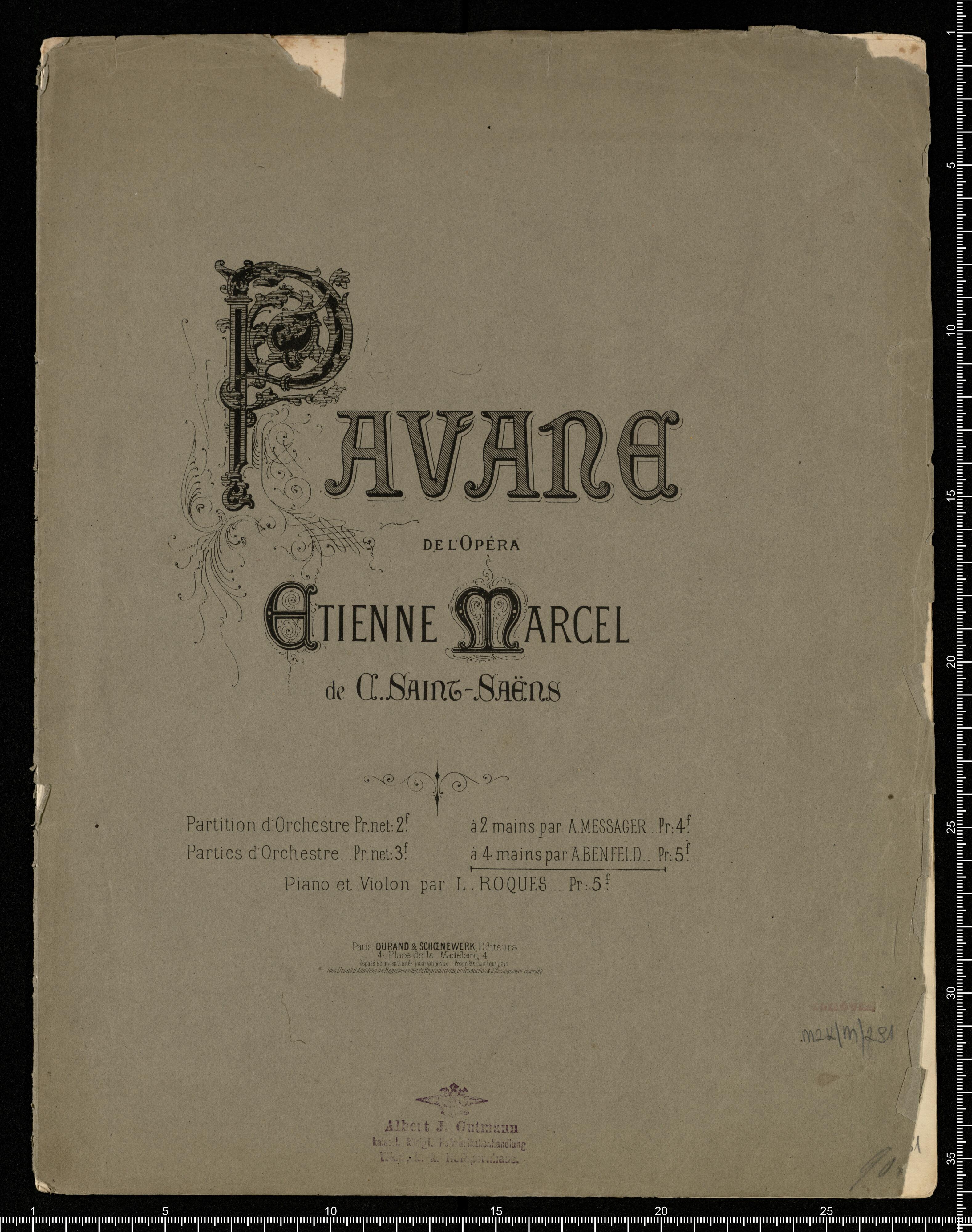 Pavane | de l'Opéra | Etiennme Marcel | de C. Saint-Saëns | [price list] à 4 mains par A.BENFELD [= Albert Kopff]. Pr. 5(F). | Paris, DURAND & SCHŒNEWERK, Editers | 4. Place de la Madeleine, 4 | Déposé selon les traités internationaux. Proprieté pour tous pays | Tous Droits d'audition, de Reproduction, de Traduction & d'Arrangements reservés