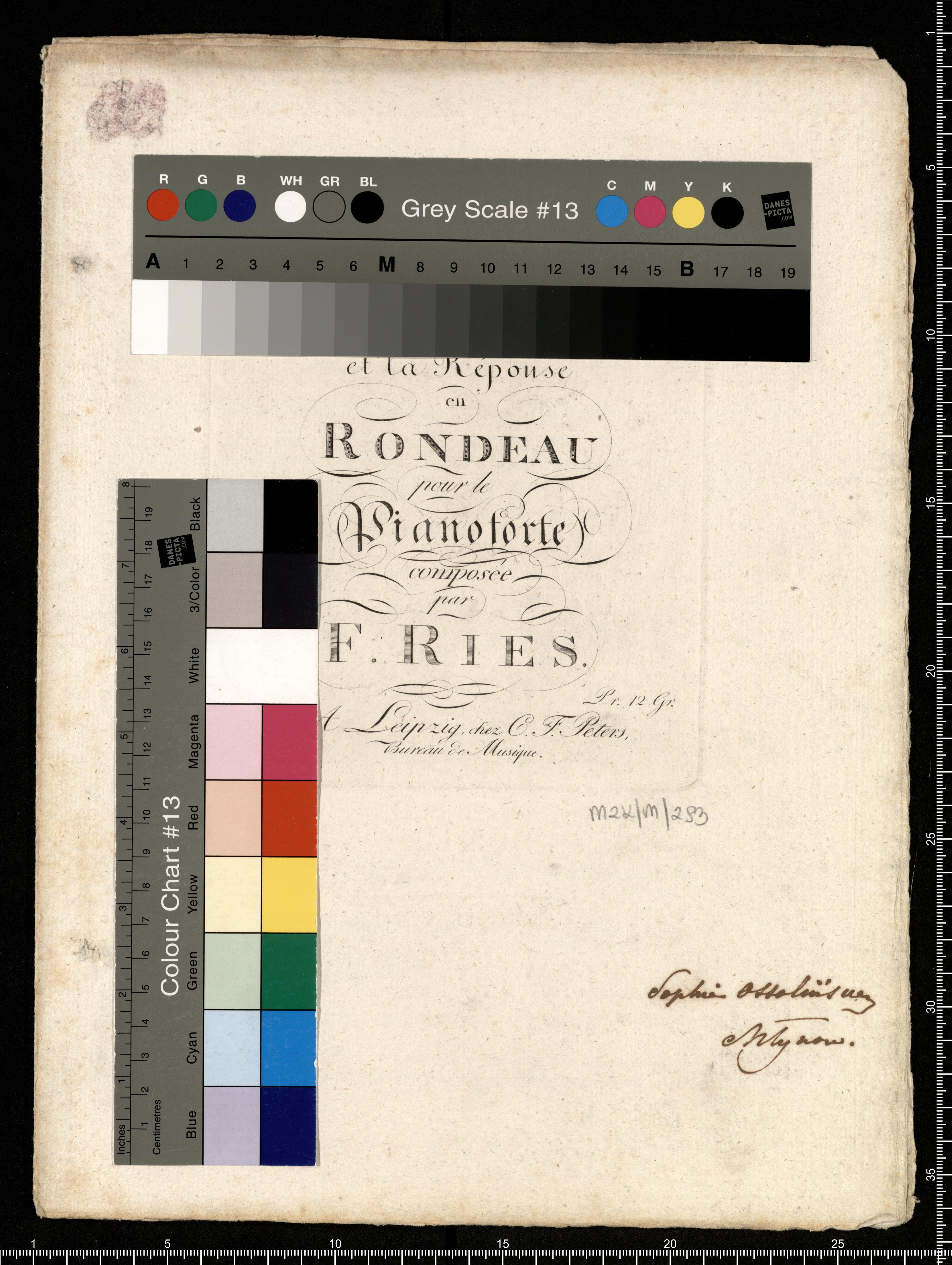 ROMANCE | "Que veut il dire. " | et la Réponse | en | RONDEAU | pour le | Pianoforte | composée | par | F. RIES. | Oe. 43. Pr. 12 Gr. | A Leipzig, chez C.F.Peters, | Bureau de Musique