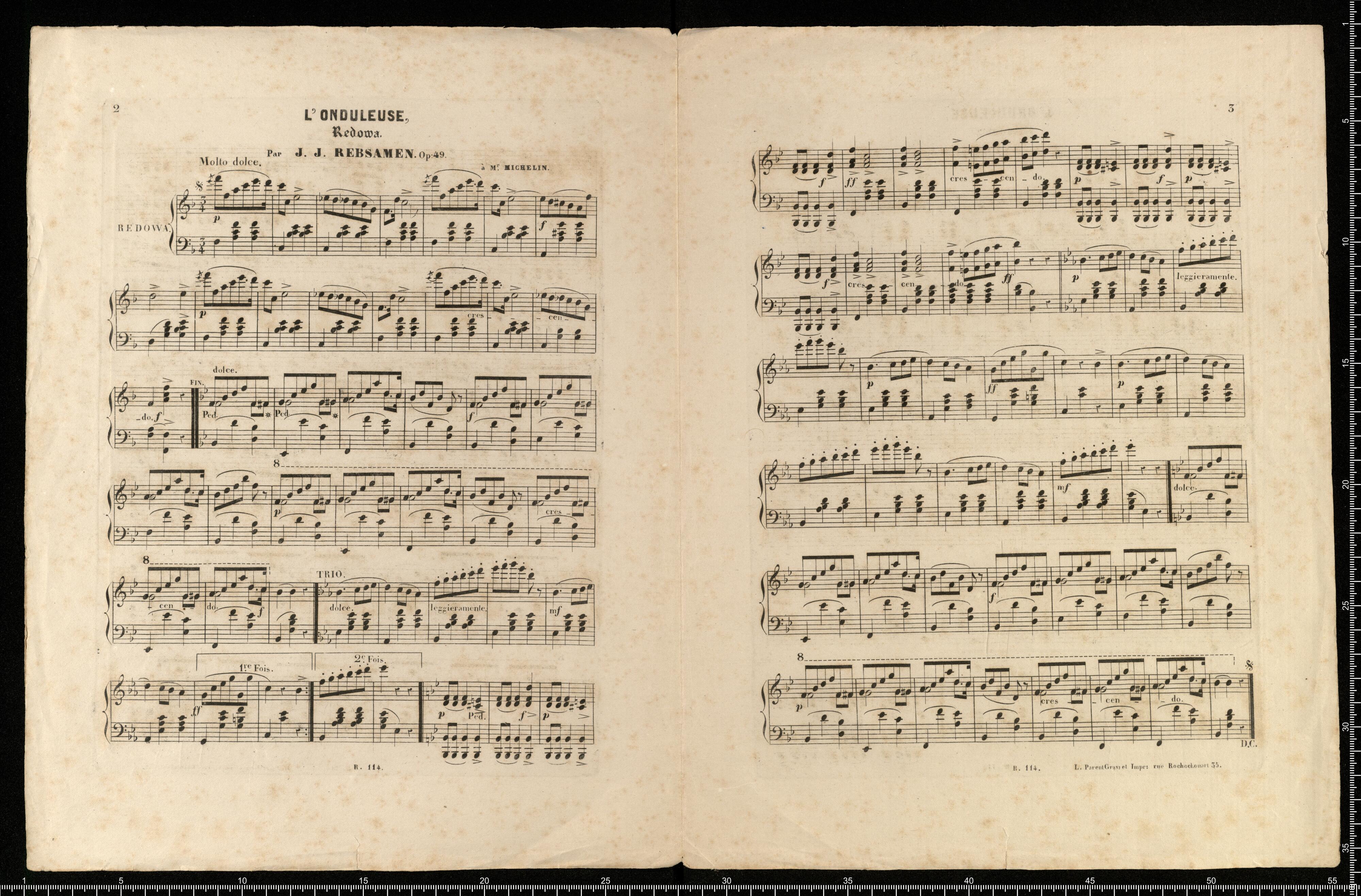 A. M. Michelin, | L'ONDELEUSE | REDOWA | Facile et Brillante | Composée | Pour le Piano | PAR | 2(f).50(c). | A. Lafont . | PARIS, | Chez Alphonse LEDUC, Eduteur, Rue Vivienne, 18