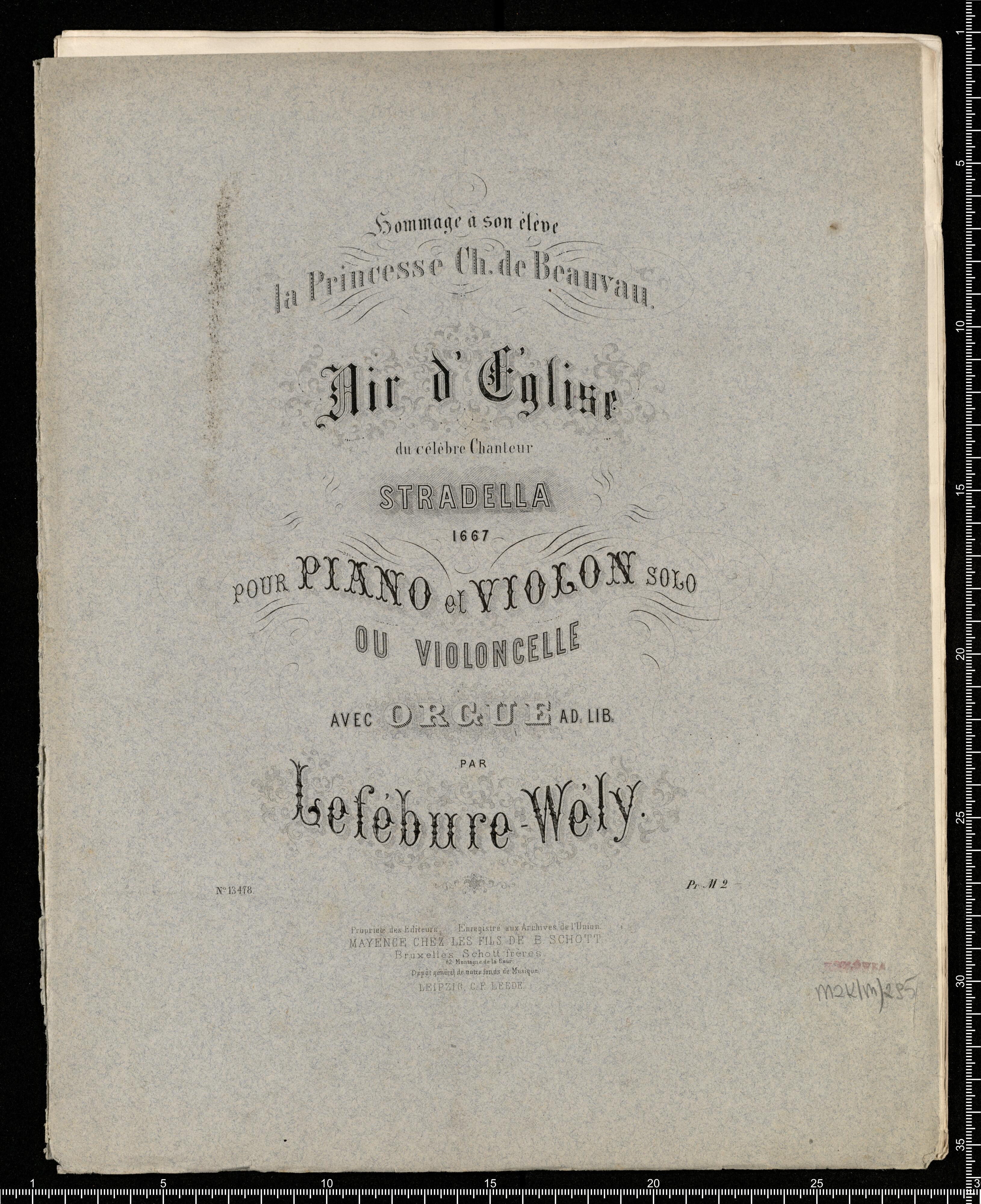 Hommage à son élève | la Princesse Ch. de Beauvau. | Air d'Eglise | du célèbre Chanteur | STRADELLA | 1667 | POUR PIANO et VIOLON SOLO | OU VIOLONCELLE | AVEC ORGUE AD. LIB. | PAR | Lefébure-Wély. | N°.13478. Pr. M 2.- | Proprieté des Editeurs. Enregistré aux Archives de l'Union .| MAYENCE CHEZ LES FILS DE B. SCHOTT. | Bruxelles, Schott frères. 82 Montagne de la Cour. Londres, Schott & C(ie). 159 Regent Street. | Dépôt général de notre fonds de Musique. | LEIPZIG. C.F. LEEDE