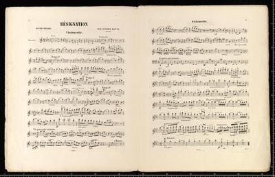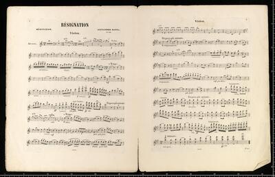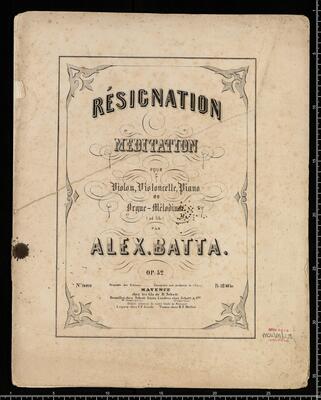 RÉSIGNATION | MEDITATION | POUR | Violon, Violoncelle, Piano | OU | Orgue-Mélodium | { ad lib.} | PAR | ALEX. BATTA. | OP: 52. |N°. 14919. Proprieté des Editeurs. Enregistré aux Archives de l'Union . pR. 1 fl.48 kr.| MAYENCE | chez les fils de B. Schott. | Bruxelles, Schott frères. 82 Montagne de la Cour. Londres, Schott & C(ie). 159 Regent Street. | Dépôt général de notre fonds de Musique. | Leipzig chez C.F. Leede. Vienne chez H.F. Müller, Résignation vl, vlc, pf, harmonium. 52