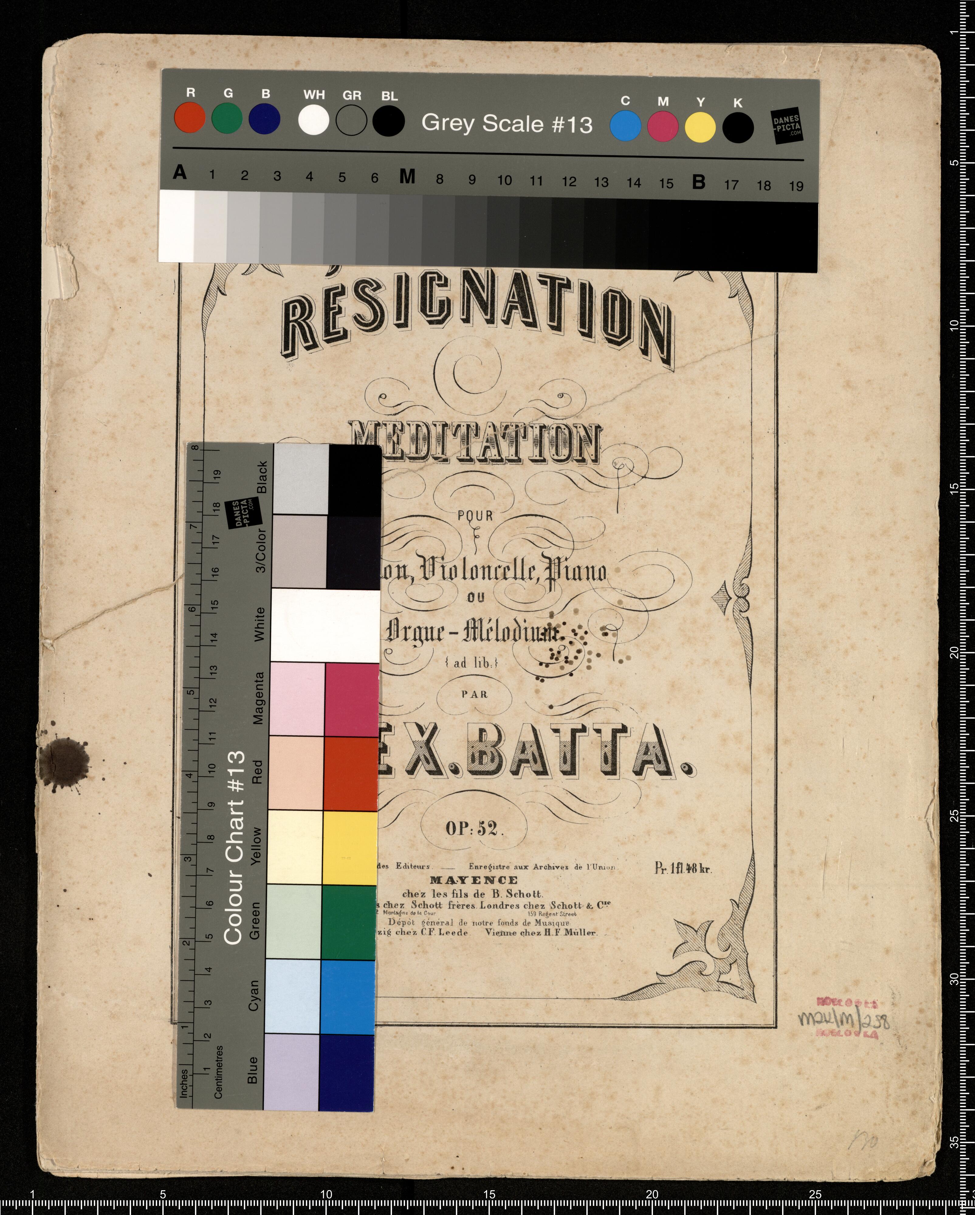 RÉSIGNATION | MEDITATION | POUR | Violon, Violoncelle, Piano | OU | Orgue-Mélodium | { ad lib.} | PAR | ALEX. BATTA. | OP: 52. |N°. 14919. Proprieté des Editeurs. Enregistré aux Archives de l'Union . pR. 1 fl.48 kr.| MAYENCE | chez les fils de B. Schott. | Bruxelles, Schott frères. 82 Montagne de la Cour. Londres, Schott & C(ie). 159 Regent Street. | Dépôt général de notre fonds de Musique. | Leipzig chez C.F. Leede. Vienne chez H.F. Müller