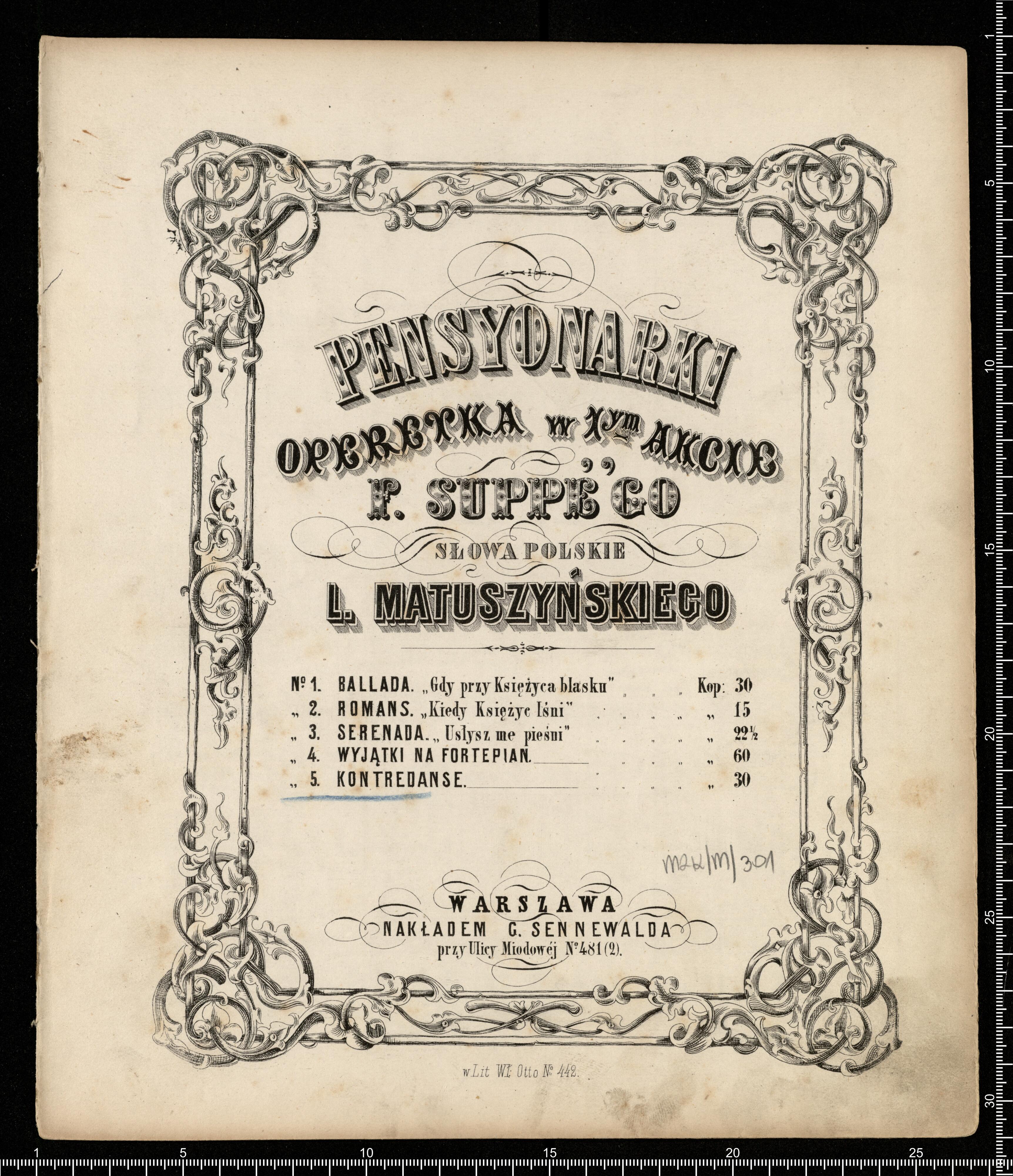 PENSYONARKI | OPERETKA W 1(YM) AKCIE | F. SUPPÉ'GO | SŁOWA POLSKIE | L. MATUSZYŃSKIEGO | [price list] | ,, 5. KONTREDANSE. .... ,, 30. | WARSZAWA | NAKŁADEM G. SENNEWALDA | przy Ulicy Miodowej N°. 481 (2). | w Lit. Wł. Otto N°. 442