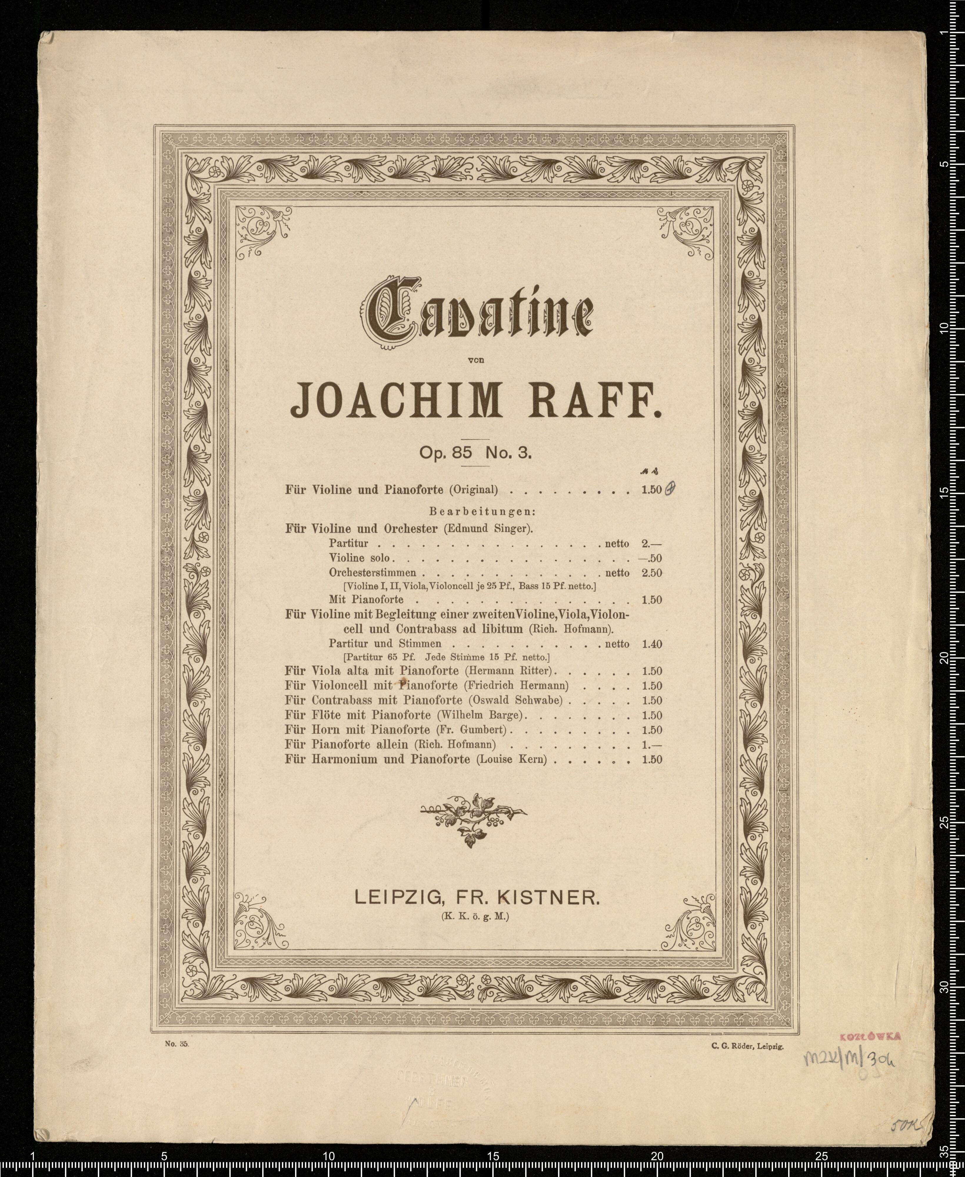 Cavatine | von | JOACHIM RAFF. | Op. 85 No. 3. | Für Violine und Pianoforte (Original) ......... 1.50 [price list] | LEIPZIG, FR. KISTNER. | (K. K. ö. g. M.) | No. 35 C.G. Röder, Leipzig