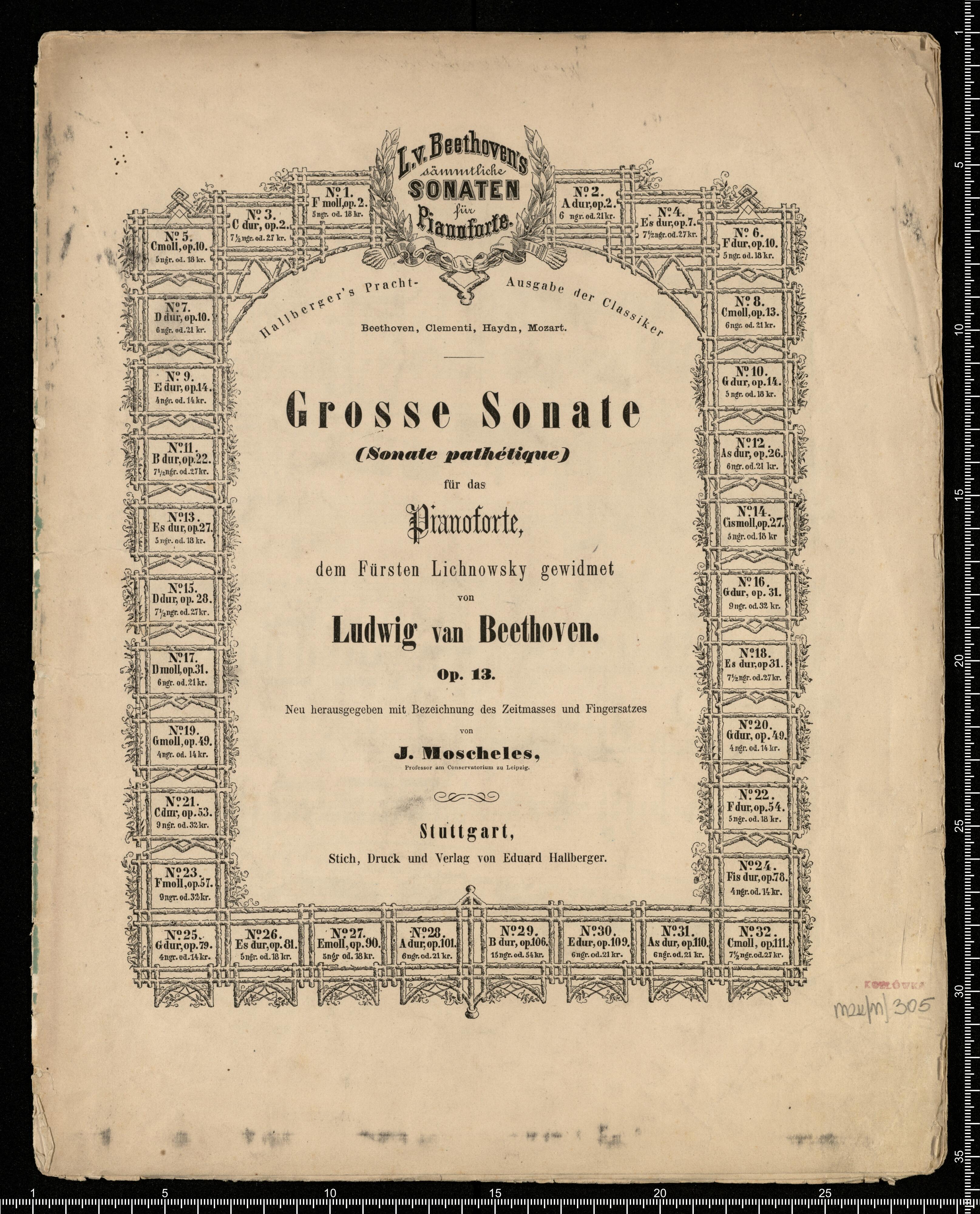 L.v.Beethoven | sämmtliche | SONATEN | für | Pianoforte. | Hallberger's Pracht- Ausgabe der Classiker | Beethoven, Clementi, Haydn, Mozart. | Grosse Sonate | (Sonate pathétique) | für das | Pianoforte | dem Fürsten Lichnowsky gewidmet | von | Ludwig van Beethoven. | Op. 13. | Neu herausgegeben mit Bezeichnung des Zeitmasses und Fingersatzes | von | J. Moscheles, | Professor am Conservatorium in Leipzig. | Stuttgart, | Stich, Druck und Verlag von Eduard Hallberger