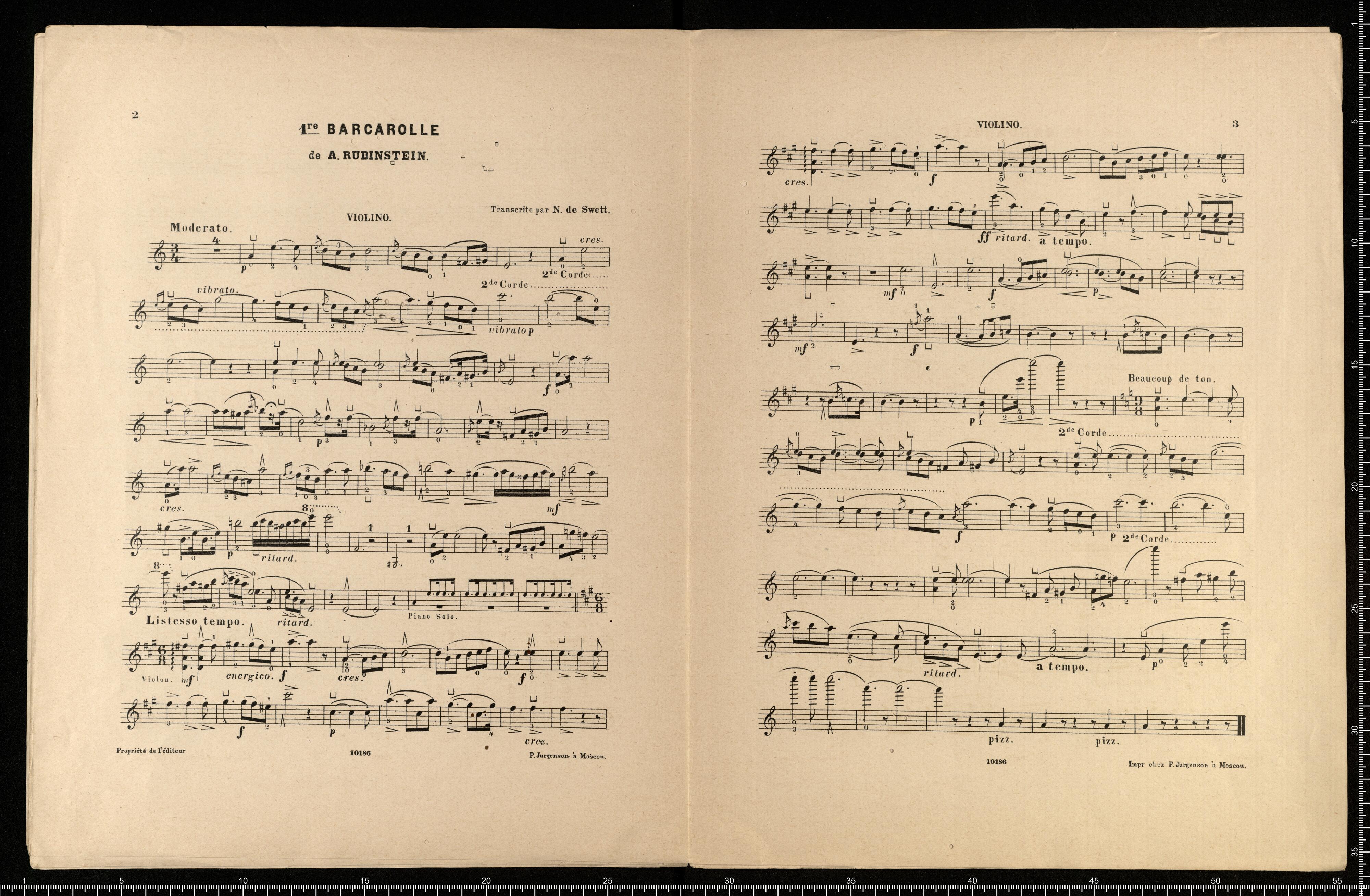 HUIT MORCEAUX | arrangés pour Violon et Piano | par | N. DE SWETT. | [price list] 6. Rubinstein, A. Op. 30 1(re) Barcarolle 60 | [price list] Proprieté de l'editeur. | MOSCOU chez P. JURGENSON, | Comissionnaire de la Chapelle de la Cour, de la Société Impériale Musicale russe | et du Conservatoire à Moscou. | Dépôts: St.-Pôtersbourg chez J. Jurgenson. | Varsovie chez G. Sennewald. | Imprimerie de musique P. Jurgenson à Moscou