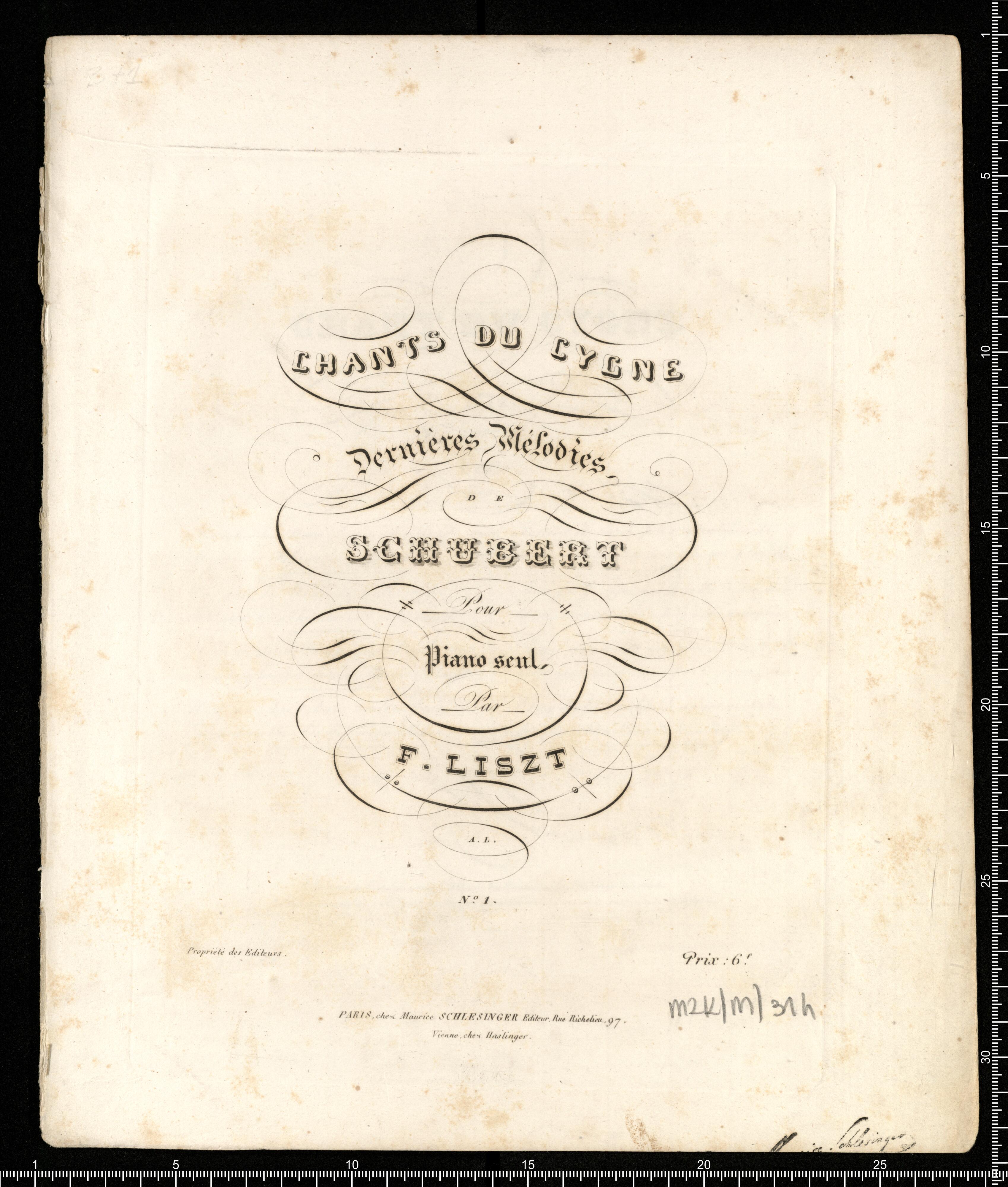 CHANTS DU CYGNE | Dernières Mélodies | DE SCHUBERT | Pour | Piano seul | Par | F. LISZT | A. L. | N|o 1. | Propriété des Editeurs. Prix: 6|f | PARIS, chez Maurice Schlesinger Editeur, Rue Richelieu,97. | Vienne, chez Haslinger