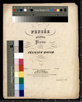 à M|m|e Joséphine de Seynes | PENSÉE | MÉLODIE | Pour Piano Seul | PAR | FÉLICIEN DAVID | N|o 8176. Propriété des Editeurs Enregistré aux Archives de l'Union. Pr: 18 kr. | MAYENCE | ANVERS ET BRUXELLES | chez les fils de B. Schott. | Dépôt général de notre fonds de Musique: à Leipzig chez C. F. Leede. à Vienne chez H. F. Müller. | Paris, au Bureau Central de Musique, Pensée pour le piano pf