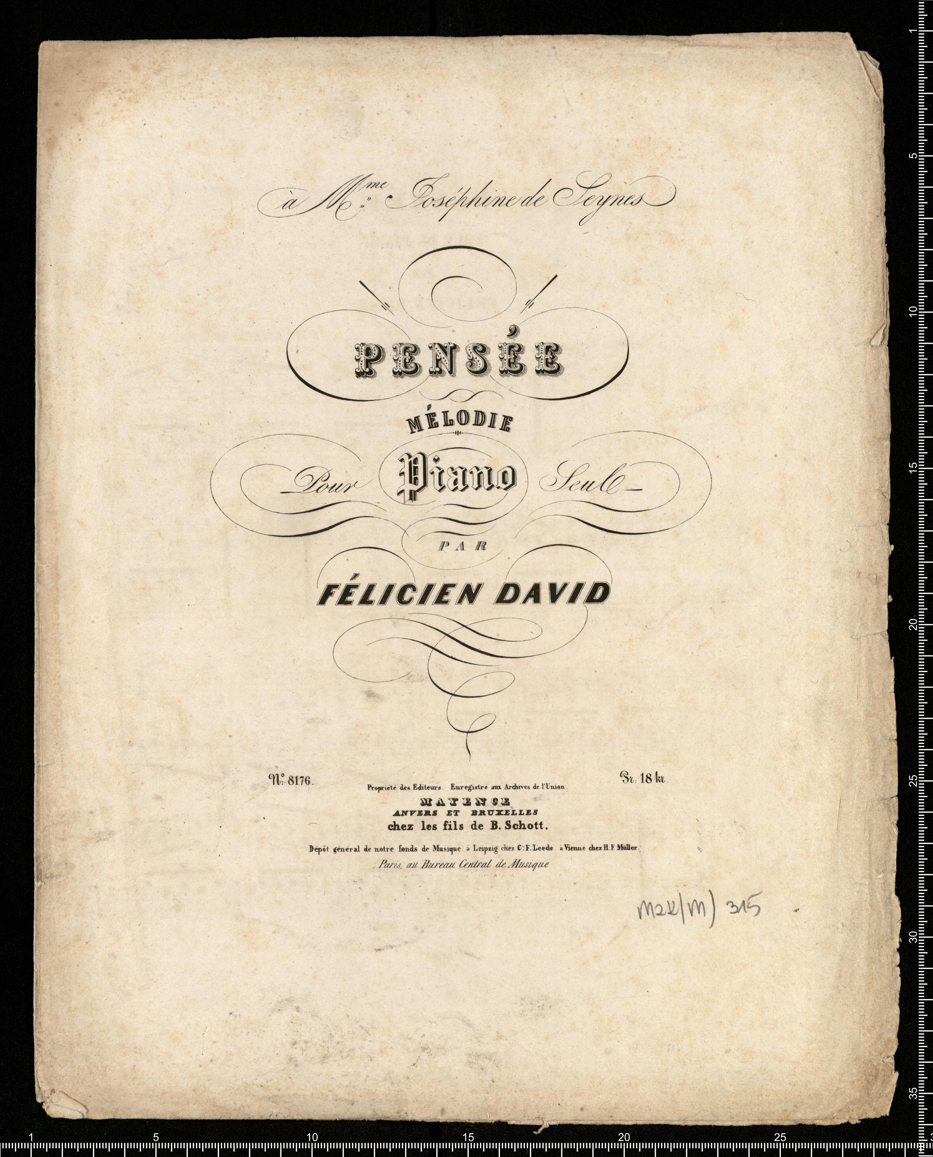 à M|m|e Joséphine de Seynes | PENSÉE | MÉLODIE | Pour Piano Seul | PAR | FÉLICIEN DAVID | N|o 8176. Propriété des Editeurs Enregistré aux Archives de l'Union. Pr: 18 kr. | MAYENCE | ANVERS ET BRUXELLES | chez les fils de B. Schott. | Dépôt général de notre fonds de Musique: à Leipzig chez C. F. Leede. à Vienne chez H. F. Müller. | Paris, au Bureau Central de Musique