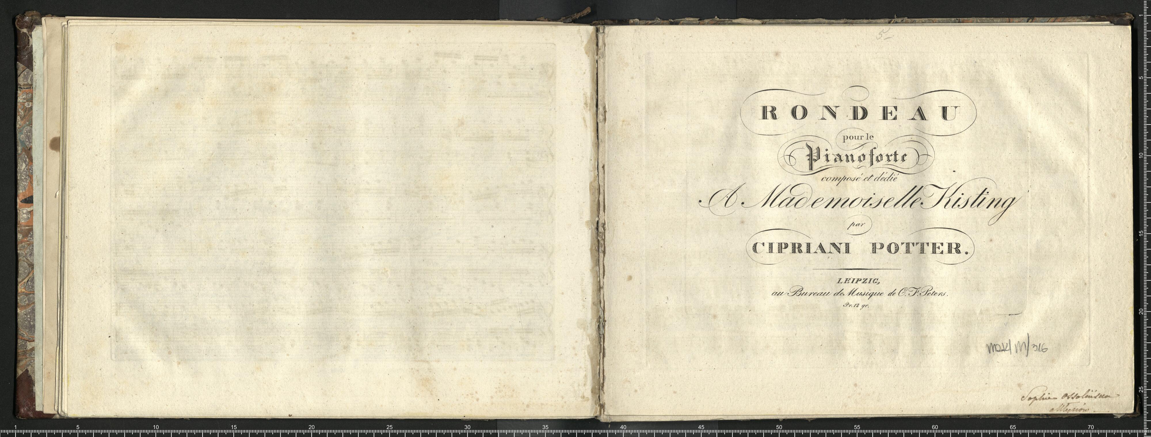 RONDEAU | pour le | Pianoforte| composé et dédié | A Mademoiselle Kisting | par | CIPRIANI POTTER. | LEIPZIG, | au Bureau de Musique de C. F. Peters. | Pr. 12 gr