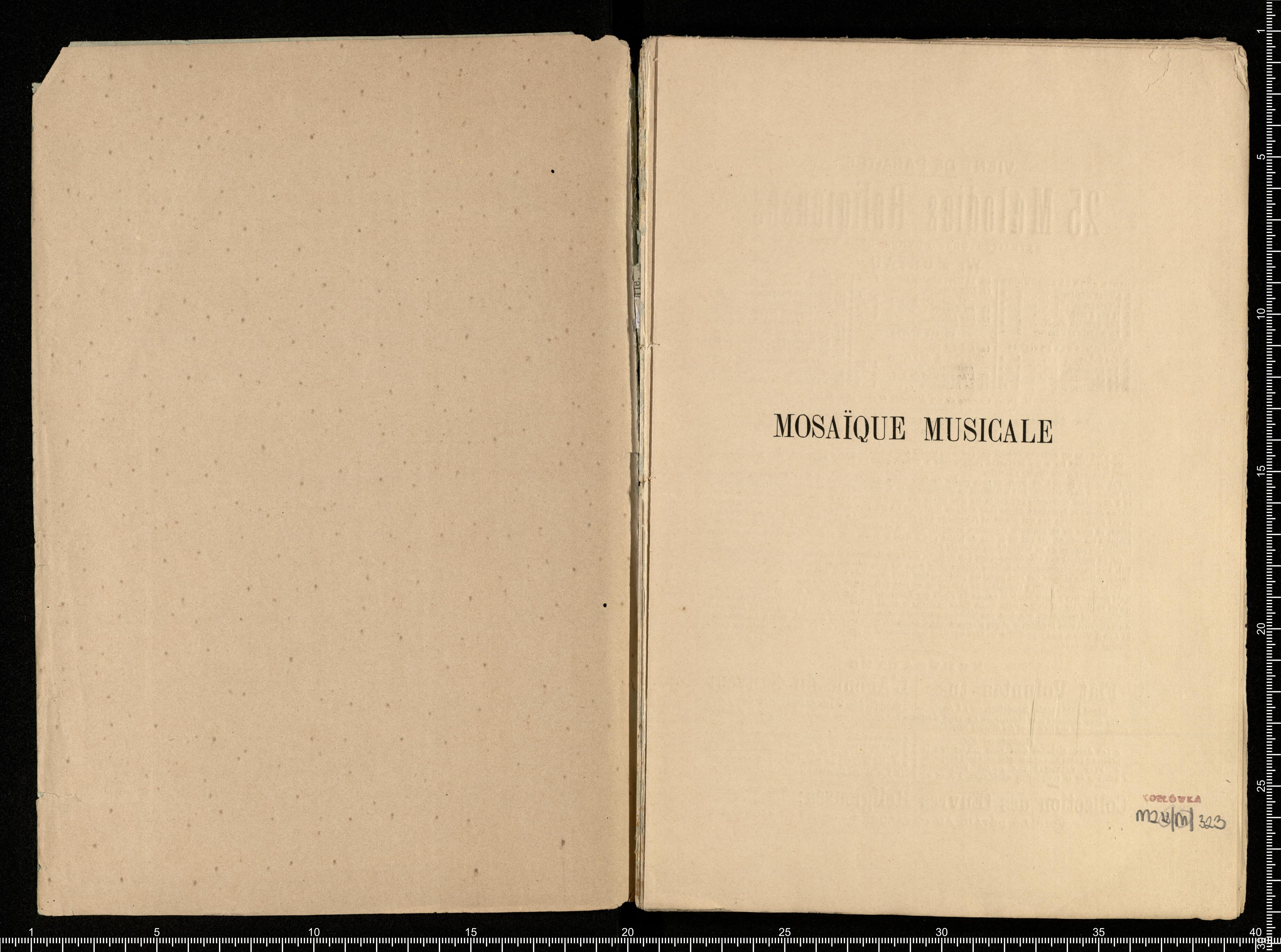 MUSIQUE D'ORGUE | NOUVELLE ÉDITION | MOSAÏQUE | MUSICALE | RECUEIL FACILE | D'Offertoires, Elévations, Communions, Sorties, etc. | POUR | ORGUE OU HARMONIUM | PAR M. L'ABBÉ | W. MOREAU | Membre de l'Académie Pontificale de Ste-Cécile | à Rome | Prix net: 8 francs [left side:] PARIS | HATON, ÉDITEUR | Rue Bonaparte, 35. [right side:] POITIERS | CHEZ L'AUTEUR | Près Sainte-Radégonde