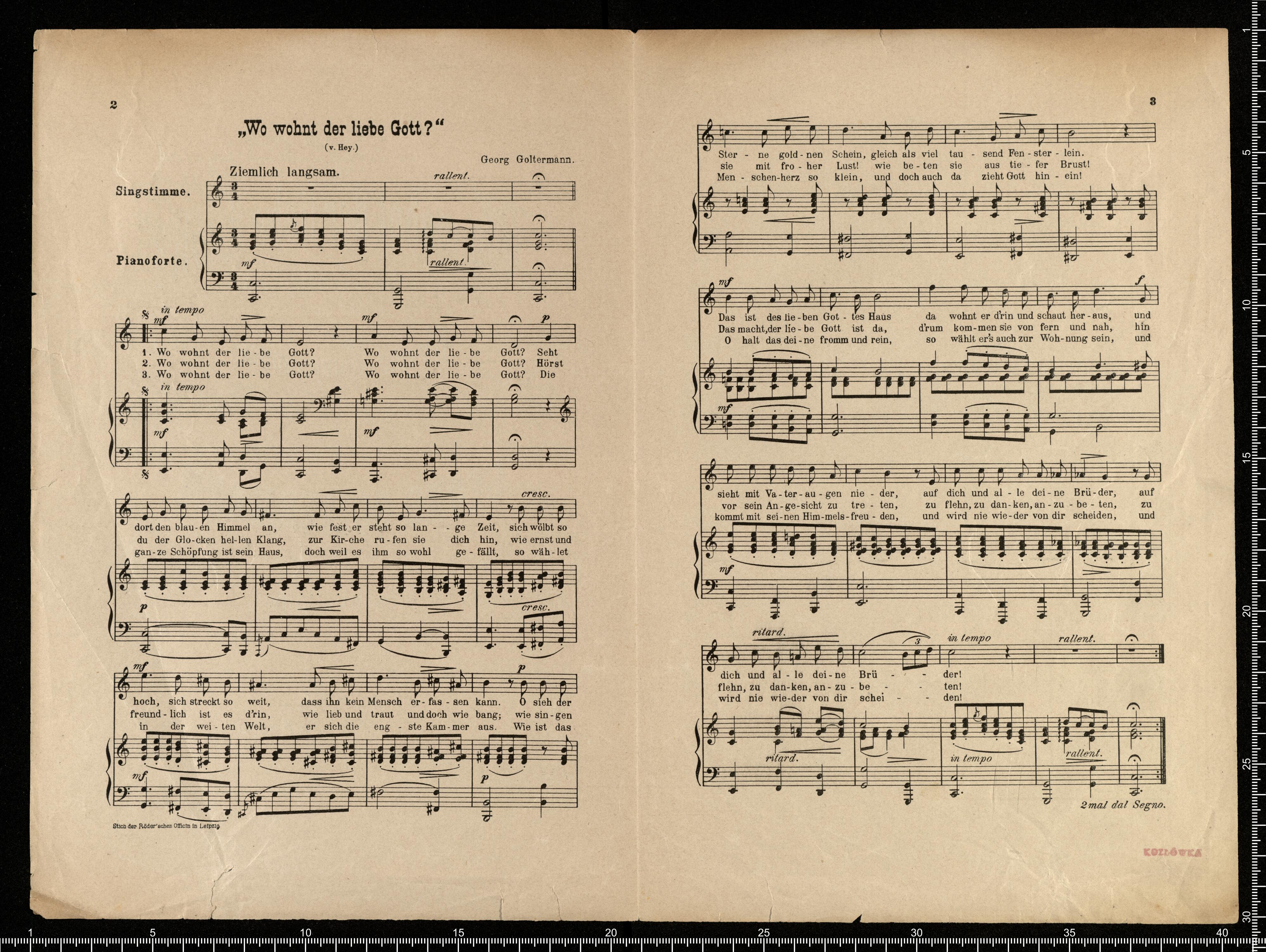 „Wo wohnt der liebe Gott?” | Gedicht von Hey | in Musik gesetzt | für eine Singstimme | mit Begleitung des Pianoforte | von | GEORG GOLTERMANN. | Musikbeilage | zu „Ueber Land und Meer.” | Weinachten 1885. | Stuttgart & Leipzig. | Deutsche Verlags-Anstalt | (Vormals Eduard Halberger.)