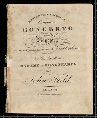 TROISIÈME CONCERTO | POUR LE PIANO-FORTE | avec accompagnement de Grand Orchestre | Composé | par | JOHN FIELD | et Dédié | a M(r). MUZZIO CLEMENTI | par | L'Auteur, Son élève | Gravé et imprimé | à S(t). Petersbourg chez Dalmas | Grande Millione N°. 43, Troisième concerto pf, orch