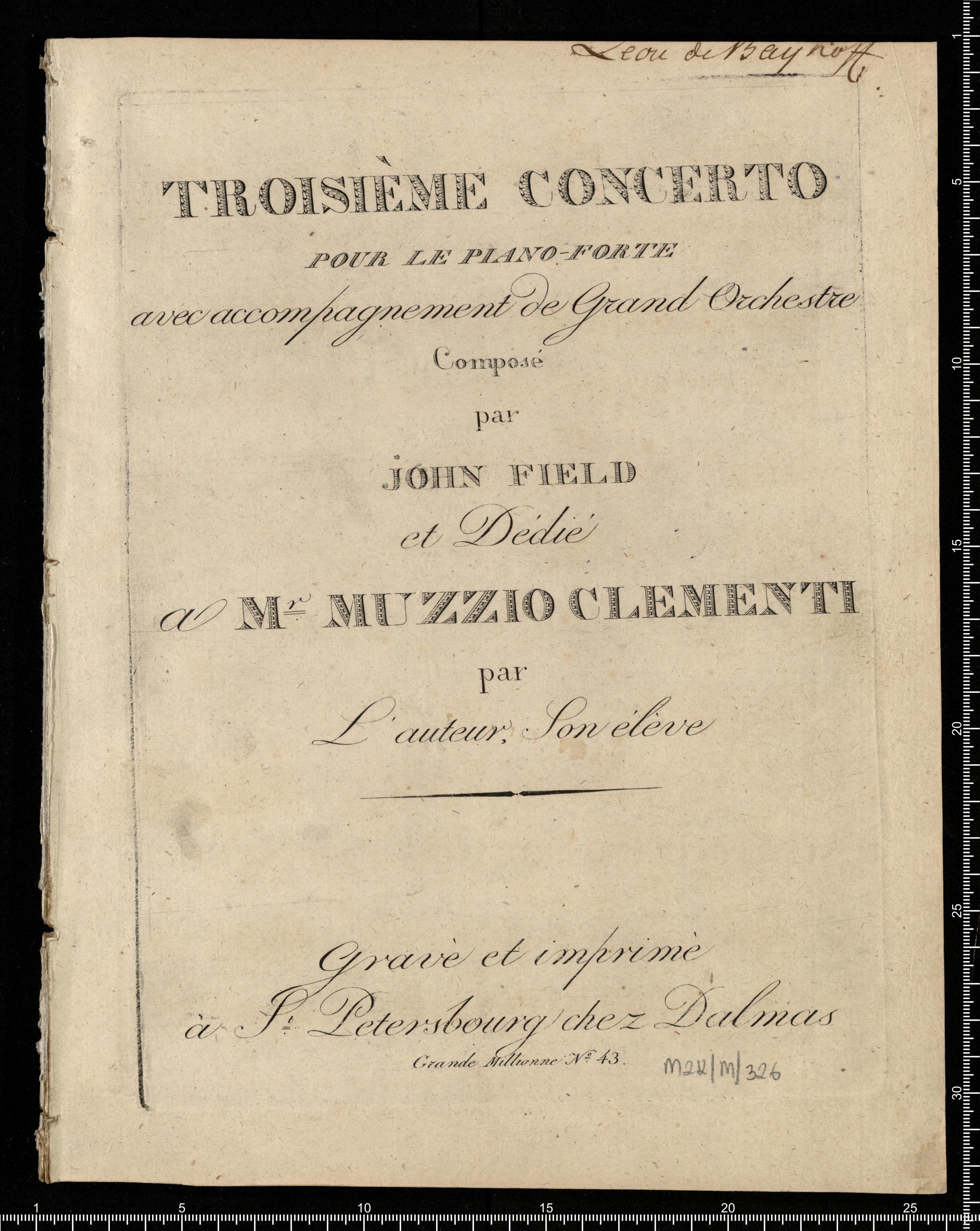 TROISIÈME CONCERTO | POUR LE PIANO-FORTE | avec accompagnement de Grand Orchestre | Composé | par | JOHN FIELD | et Dédié | a M(r). MUZZIO CLEMENTI | par | L'Auteur, Son élève | Gravé et imprimé | à S(t). Petersbourg chez Dalmas | Grande Millione N°. 43