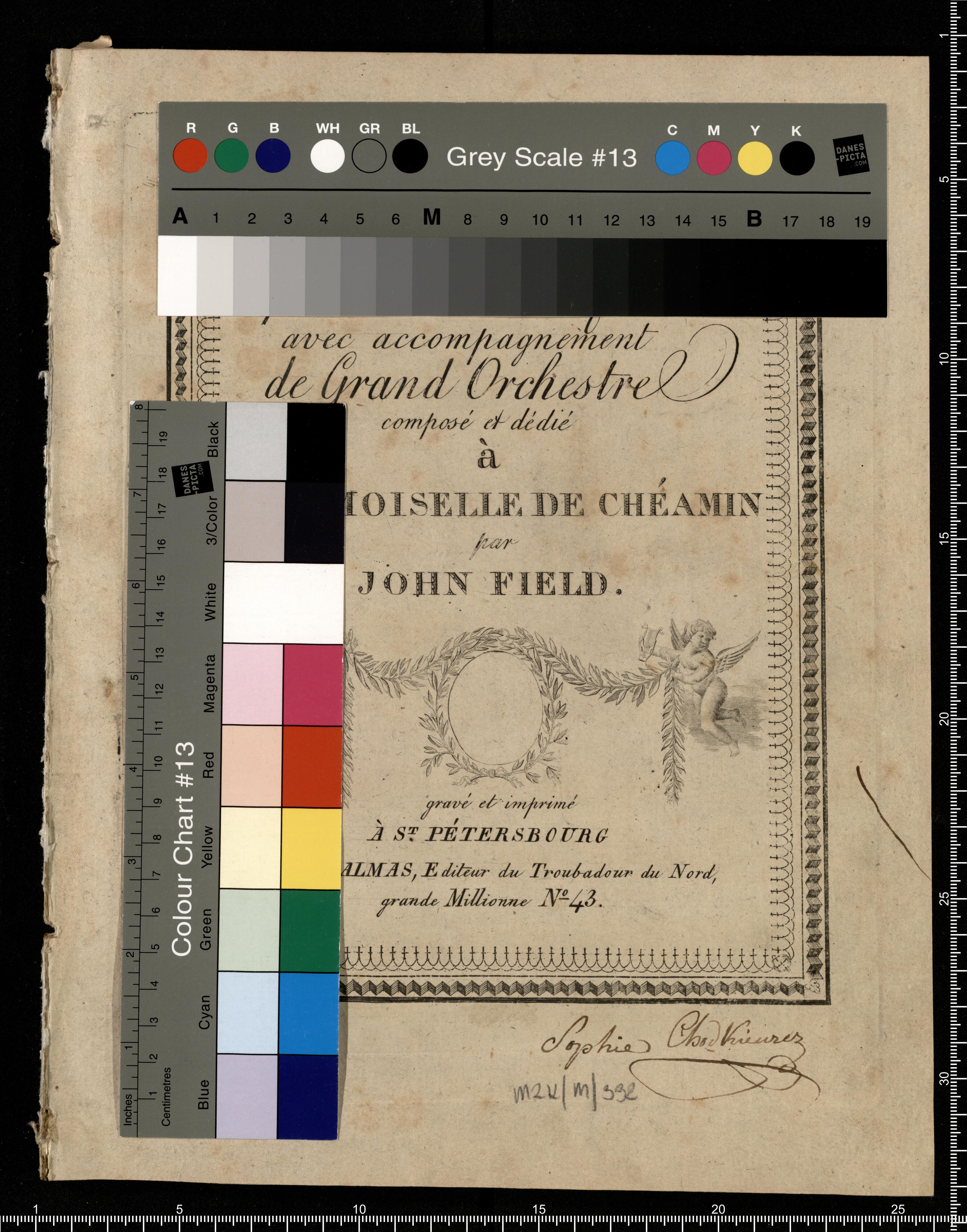 Quatrième Concerto | pour le Pianoforte | avec accompagnement | de Grand Orchestre | Composé et Dédié | à | MADEMOISELLE DE CHÉAMIN | par | JOHN FIELD. | Gravé et imprimé | à S(t). Petersbourg chez DALMAS, Editeur du Troubadour du Nord, | grande Millione N°. 43