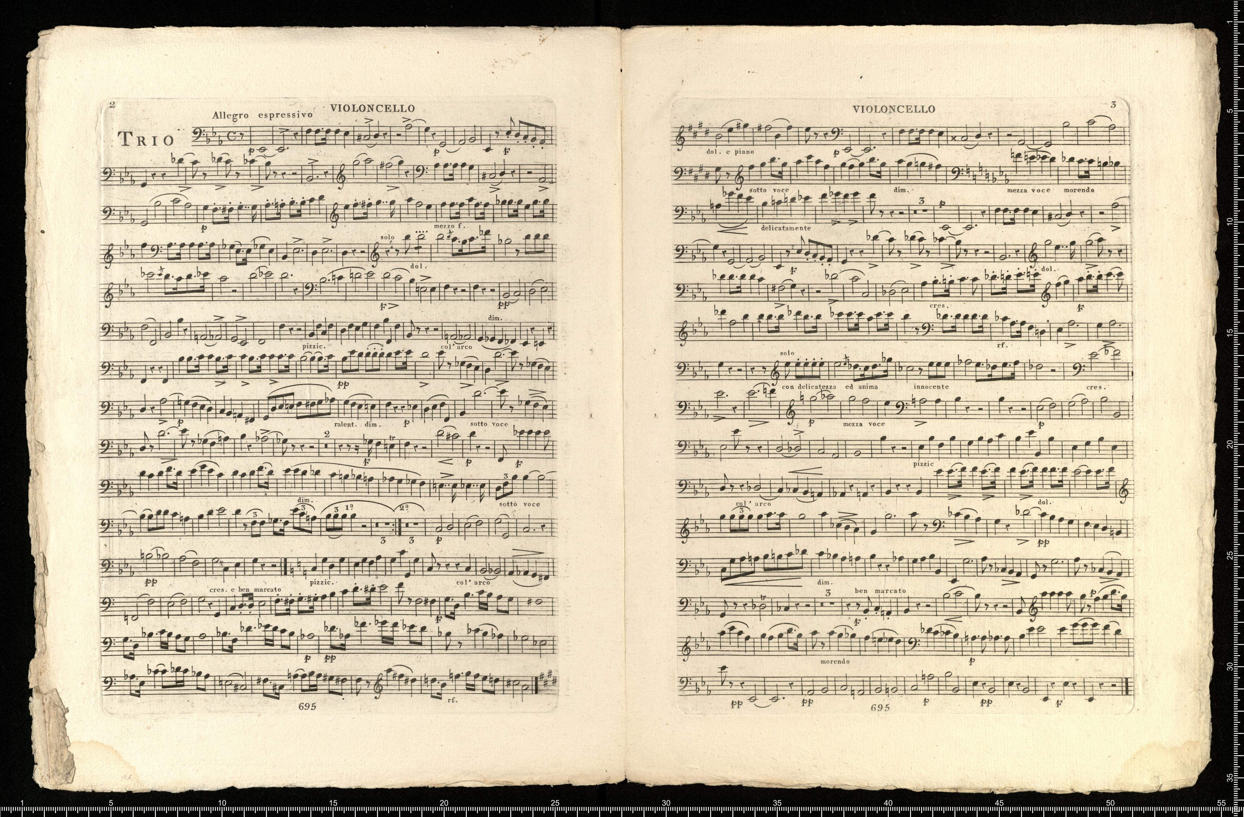 TRIO | Pouv | Le Piano-Forté | avec Violon et Violoncelle | Composeé et Dédié | à Son Altesse Sérénissime | Madame la Duchesse | DE COURLANDE | Par | Louis Ferdinand | Prince de Prusse | Gravé par Richomme | Œuvre 5,, A PARIS Prix 7(F) 10(s). | Chez PLEYEL Auteur et Editeur de Musique Rue Neuve des Petits champs N°.43. | vis- à-vis le Trésor Public | Déposé à la Biblioth(e). Imp(le). | 695