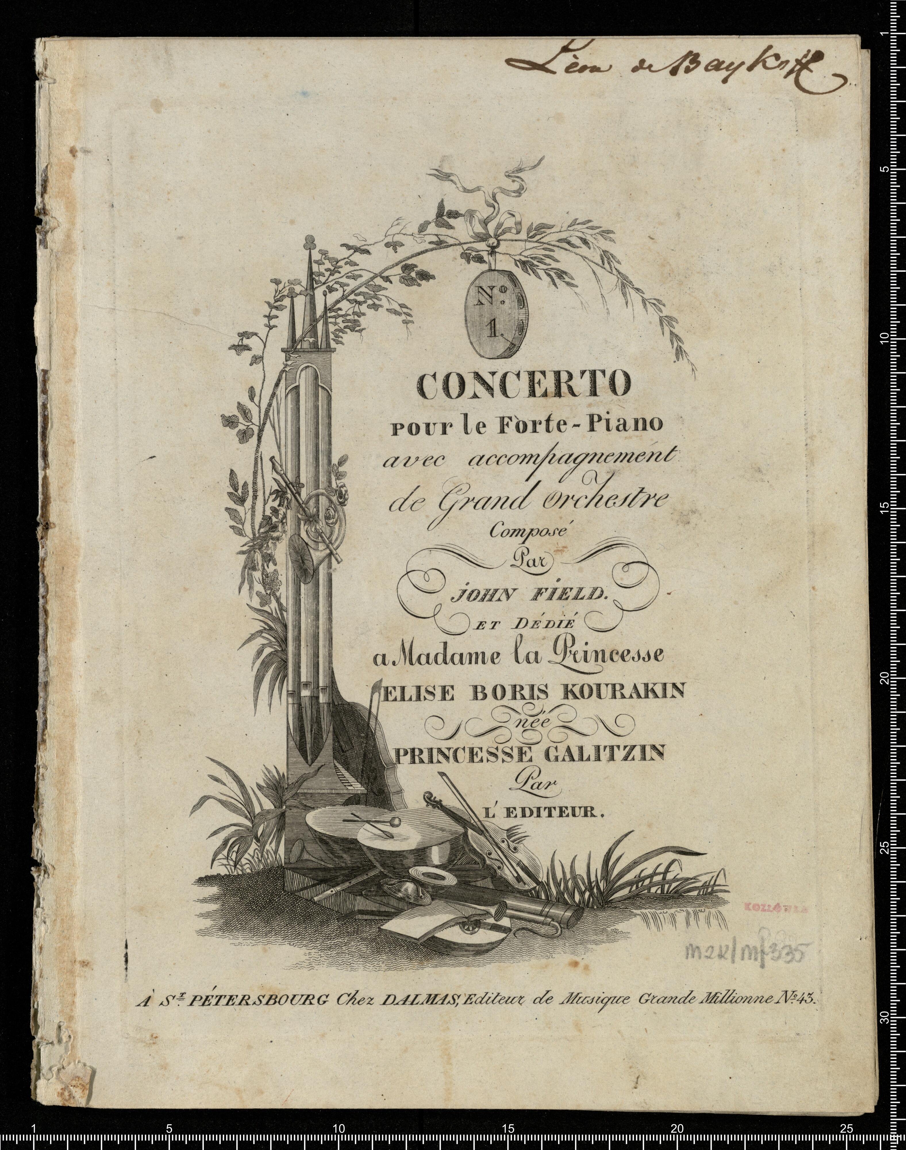 N°. 1 | CONCERTO | pour le Forte-Piano | avec accompagnement | de Grand orchestre | Composé | Par | JOHN FIELD. | et Dédié | a Madame la Princesse | ELISE BORIS KOURAKIN | née | PRINCESSE GALITZIN | Par | L'EDITEUR. | À S(t). PÉTERBOURG. | Chez DALMAS, Editeur du Musique Grande Millione N°. 43