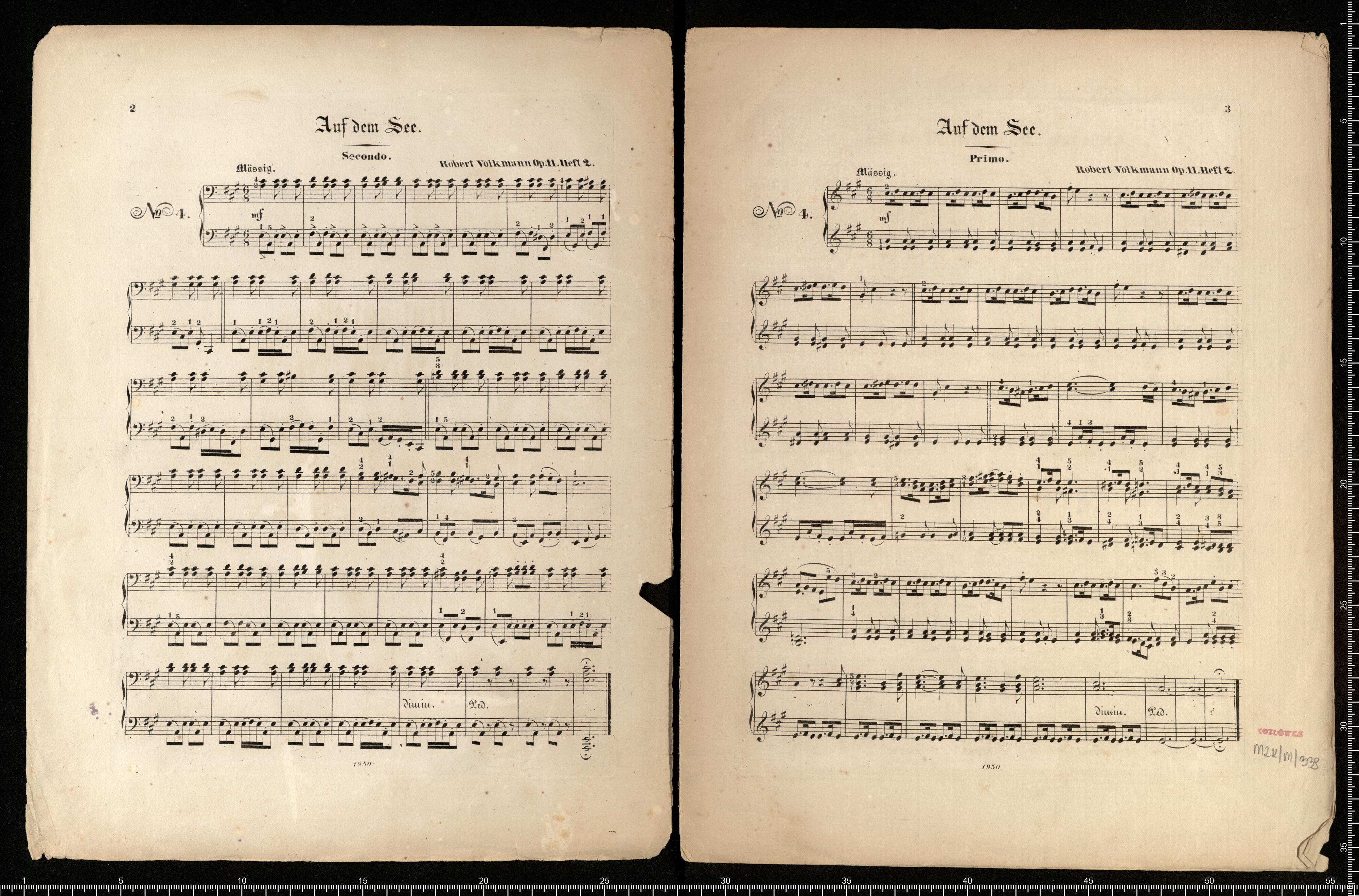 SEINEN NEFFEN | OSCAR & PAUL VOLKMANN. | Musikalisches | Bilderbuch. | SECHS STÜCKE | für das Pianoforte zu vier Händen | von | ROB. VOLKMANN. | Op. 11. HEFT 1. Pr. 20 Ngr. | HEFT 2. Pr. 20 Ngr. | Eigenthum des Verlegers. | Eingetragen in das Vereins-Archiv. | LEIPZIG, BEI FR. KISTNER. | 1949..1950