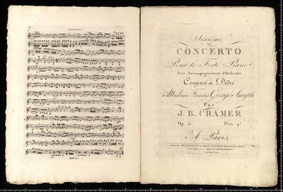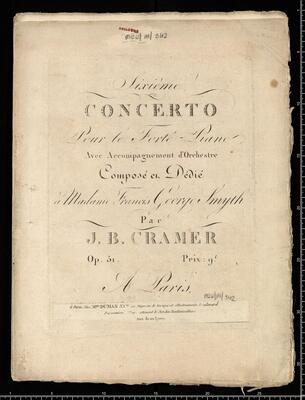 Sixième | CONCERTO | Pour le Forté-Piano | Avec Accompagnement d'Orchestre | Composé et Dédié | à Madame Francis George Smyth | Par | J.B. CRAMER | Op. 51 Prix: 9(f). | A Paris, | à Paris, Chez M(me). DUHAN & C(ie). au Magasin de Musique et d'Instruments, Boulevard | Poissoniere, N°. 10. attenant le Jardin Boulainvilliers. | Aux deux Lyres, Sixième concerto pour le forté piano orch. 51 E|b