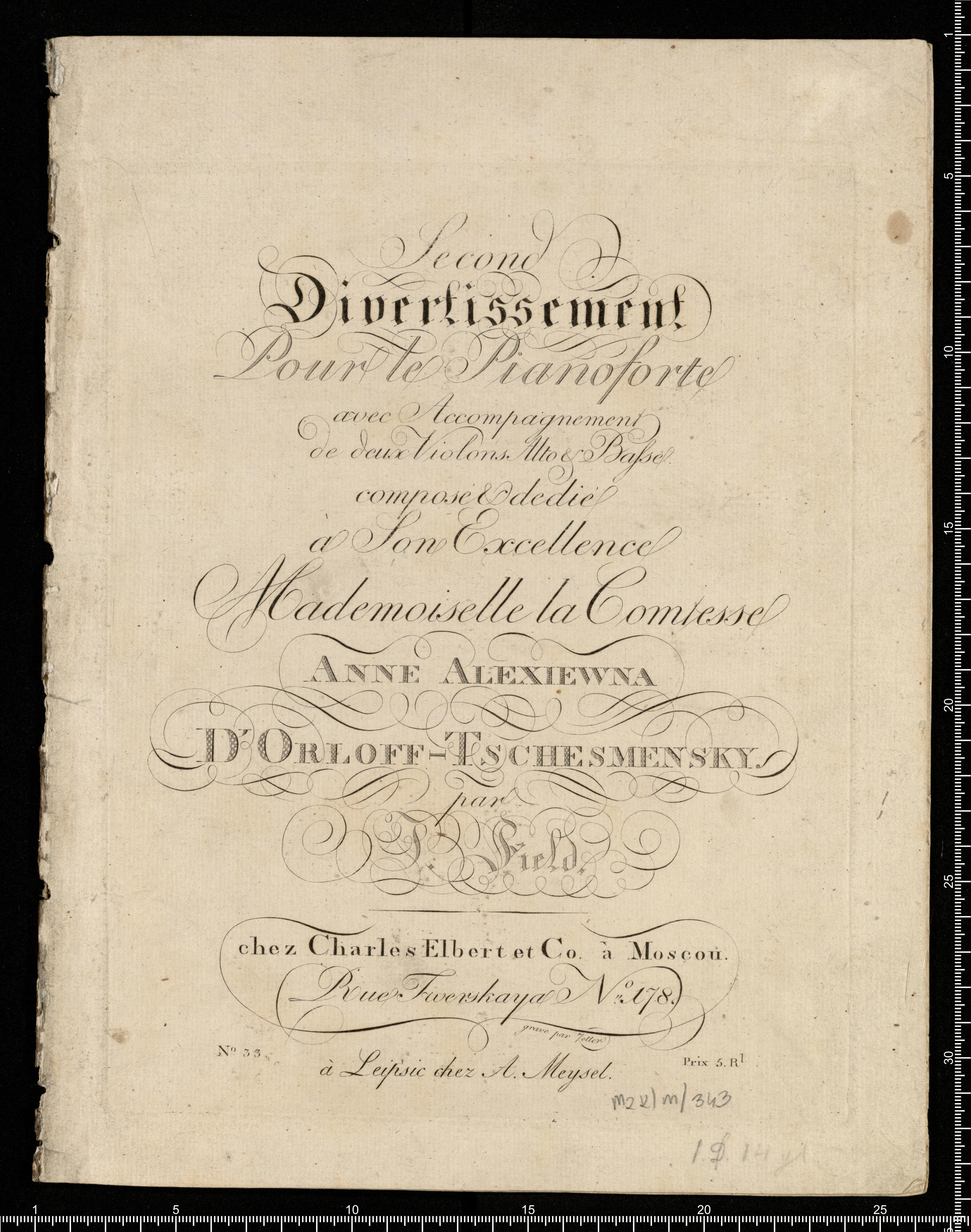 Second | Divertissement | Pour le Pianoforte | avec Accompagnement | de deux Violons, Alto & Basse | composé & dedié | à Son Excellence | Medemoiselle la Comtesse | Anne Alexiewna | D'Orloff-Tschesmensky | par | J. Field. | chez Charles Elbert et Co. à Moscou. | Rue Twerskaya N°. 178. | grave par Zetter | N° 33 Prix 5. R(l). | à Leipsic chez A. Meysel