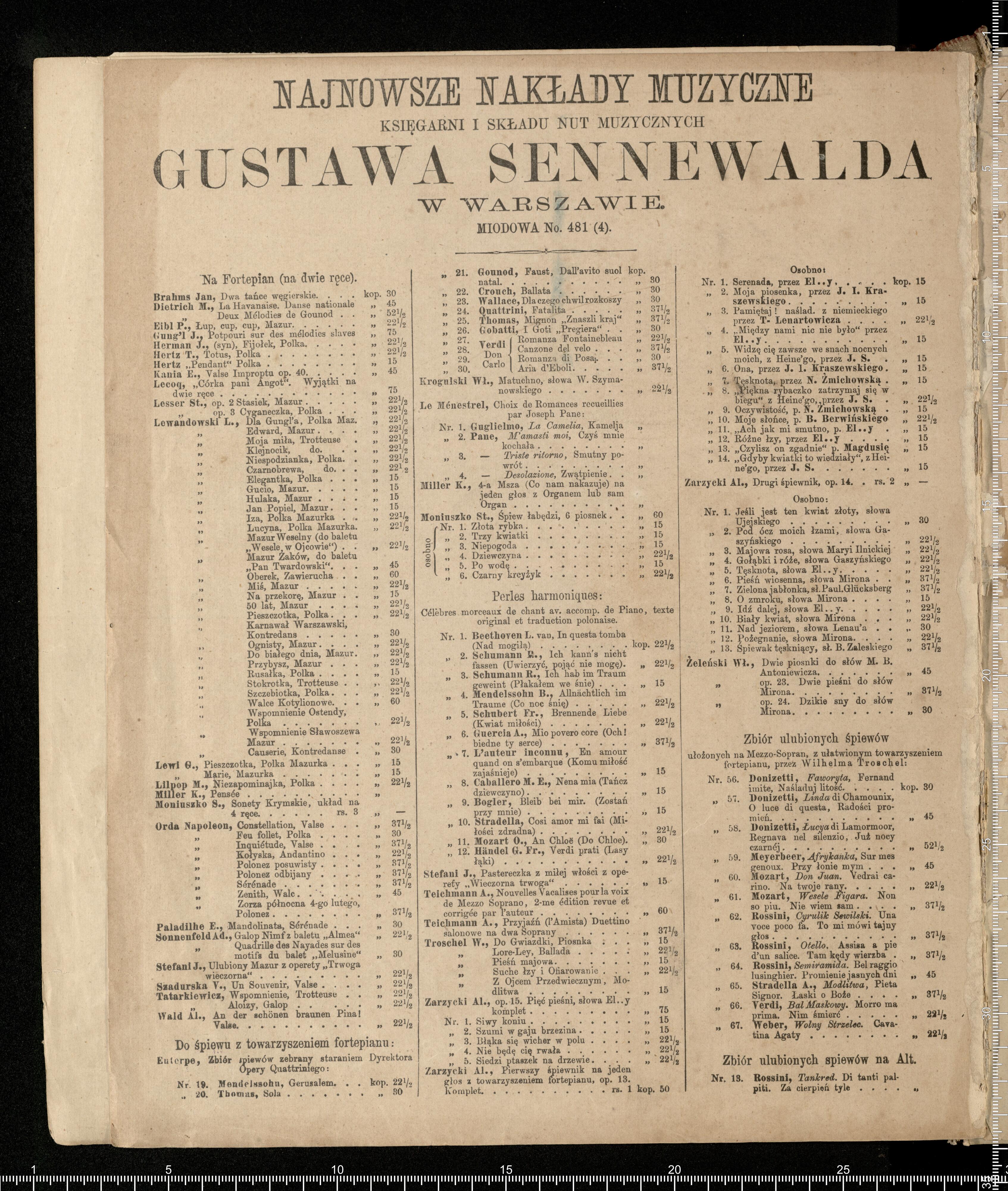 Zbiór ulubionych Spiewów | ułożonych na | Mezzo-Sopran | z łatwym układem Fortepianu | przez | Wilhelma Troschel. | Artystę Opery. | Numera oznaczone znakiem * mogą służyć również na głos Barytonowy. | 2. Bellini, Lunatyczka Ah! non credea mirarti Ah! Jak wątłe jest twe życie 22 1/2. Kop. [price list] | WARSZAWA, NAKŁADEM G. SENNEWALDA. | Ulica Miodowa N°. 4. | Zakład litogr. C.Fr.Rödera w Lipsku
