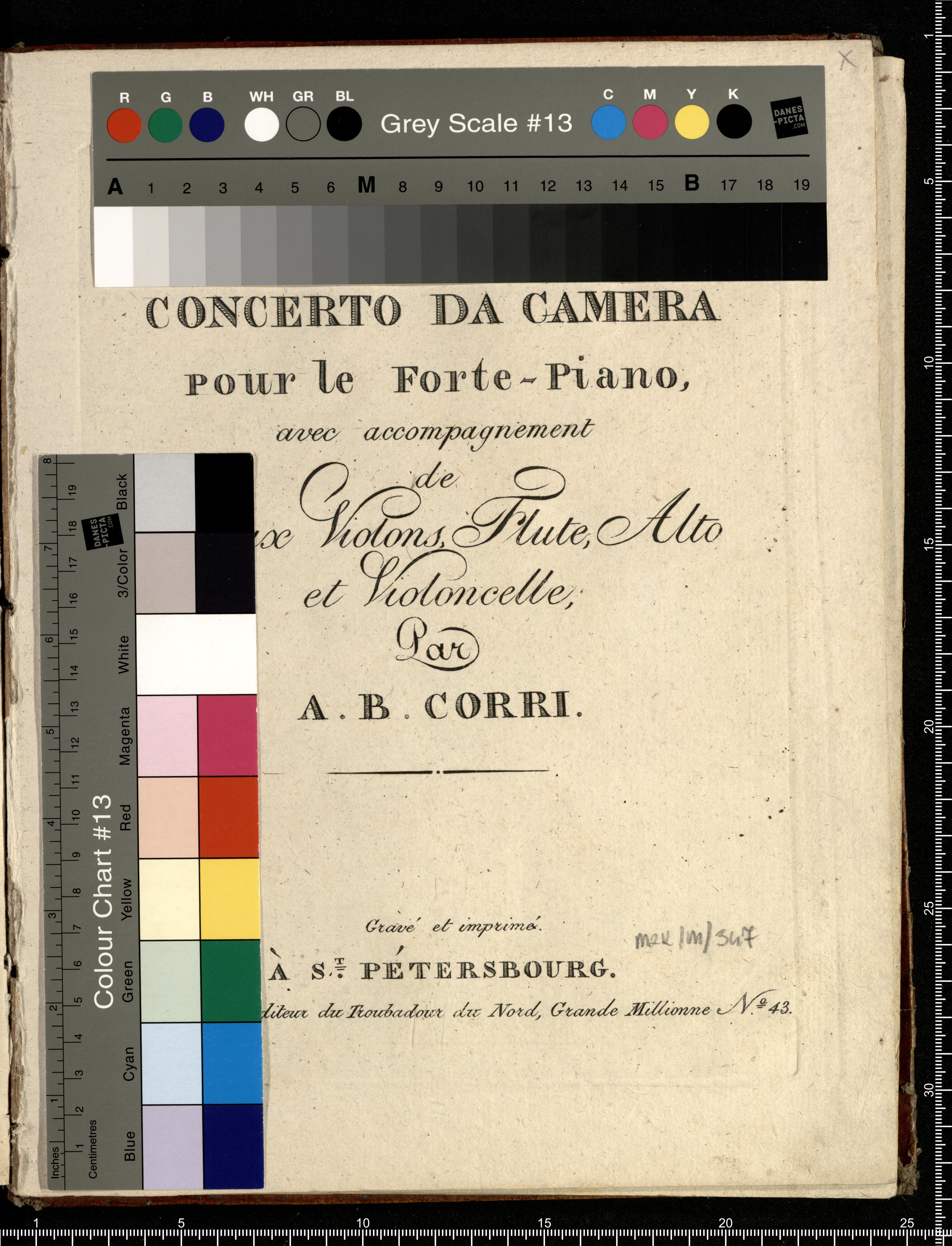 Troisième | CONCERTO DA CAMERA | pour le Forte-Piano, | avec accompagnement | de | Deux Violons, Flute, Alto | et Violoncelle, | Par | A. B. CORRI. | Gravé et imprimé. | À S|T PÉTERSBOURG. | Chez DALMAS Editeur du Troubadour du Nord, Grande Millionne N|o 43