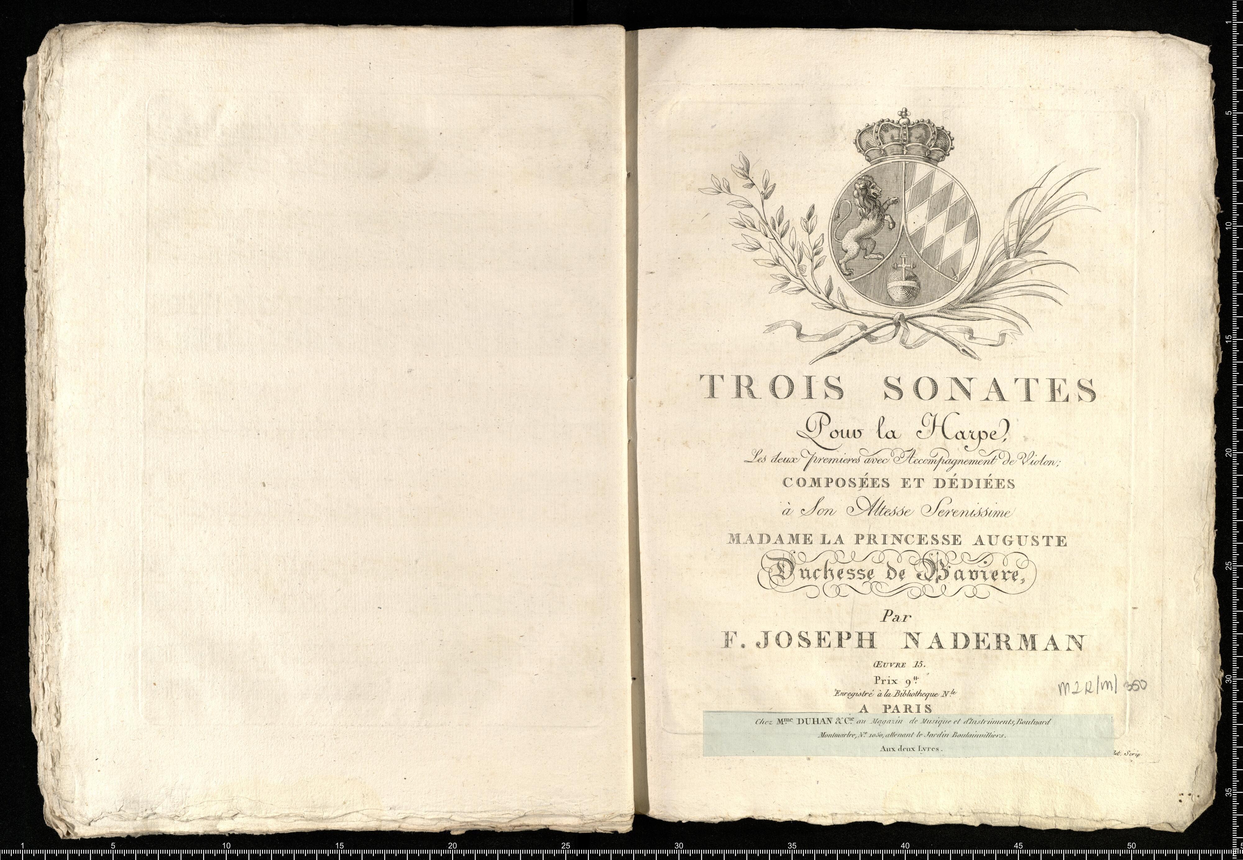 TROIS SONATES| Pour la Harpe, | Les deux premieres avec Accompagnement de Violon, | COMPOSÉES ET DEDIÉES | à Son Altesse Serenissime | MADAME LA PRINCESSE AUGUSTE | Duchesse de Baviere, | Par | JOSEPH NADERMAN | Œuvre 15. | Prix 9 (F). | Enregistré à la Bibliotheque N(le). | A PARIS | Chez M(me). DUHAN & C(ie). au Magazin de Musique et d'Instruments, Boulevard | Montmartre, N°. 1050, attenant le Jardin Boulanvilliers. | Aux deux Lyres