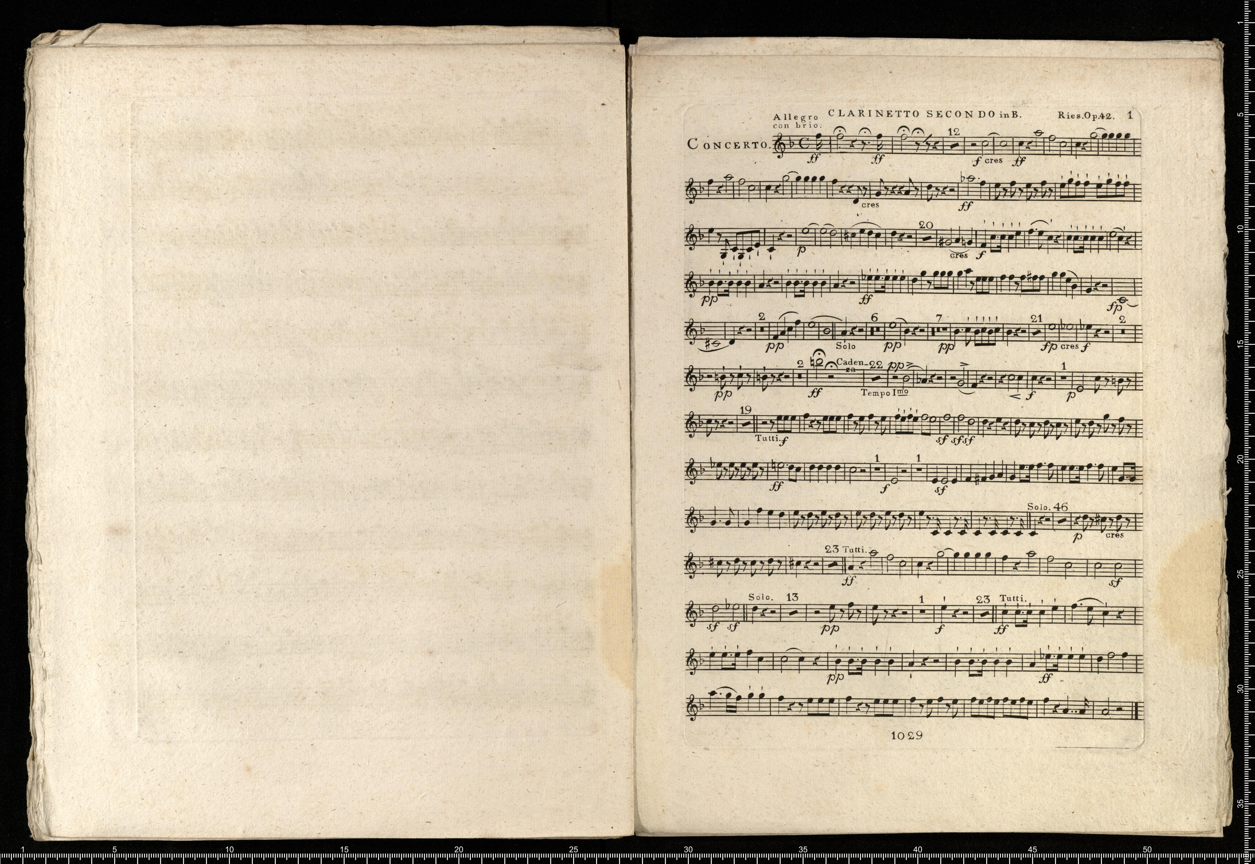 CONCERTO | pour le | Pianoforte | avec accompagnement | de 2 Violons, 2 Clarinettes, 1 Flûte, 2 Bassons, 2 Cors, | 2 Trompettes, Timbales, Alto et Basse | composé et dédié | à Son Altesse Impériale | Rodolphe | Archeduc d'Autriche | par | Ferd. Ries. | Oe. 42. Pr. 3 R. | À LEIPZIG | chez A. Kühnel, | Bureau de Musique