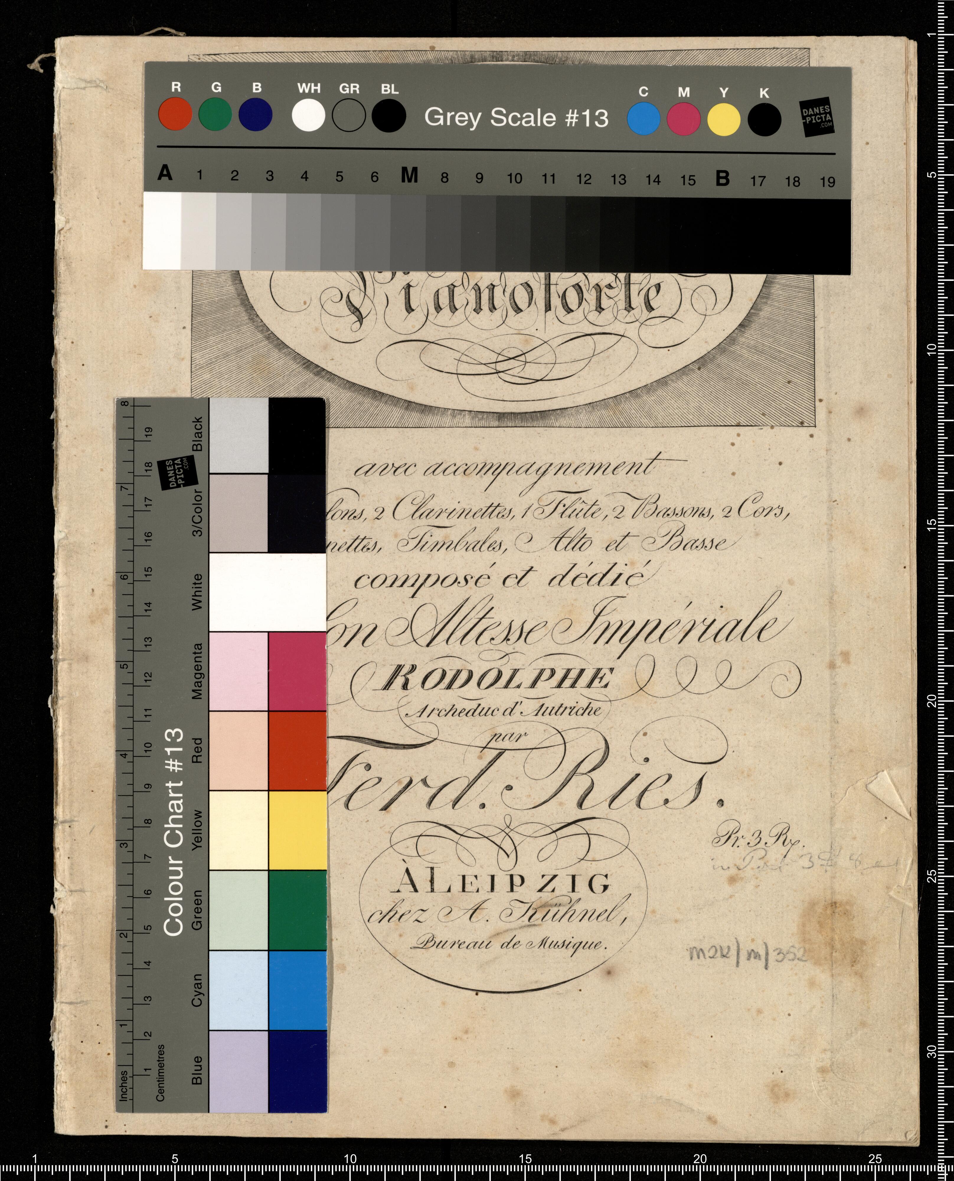 CONCERTO | pour le | Pianoforte | avec accompagnement | de 2 Violons, 2 Clarinettes, 1 Flûte, 2 Bassons, 2 Cors, | 2 Trompettes, Timbales, Alto et Basse | composé et dédié | à Son Altesse Impériale | Rodolphe | Archeduc d'Autriche | par | Ferd. Ries. | Oe. 42. Pr. 3 R. | À LEIPZIG | chez A. Kühnel, | Bureau de Musique