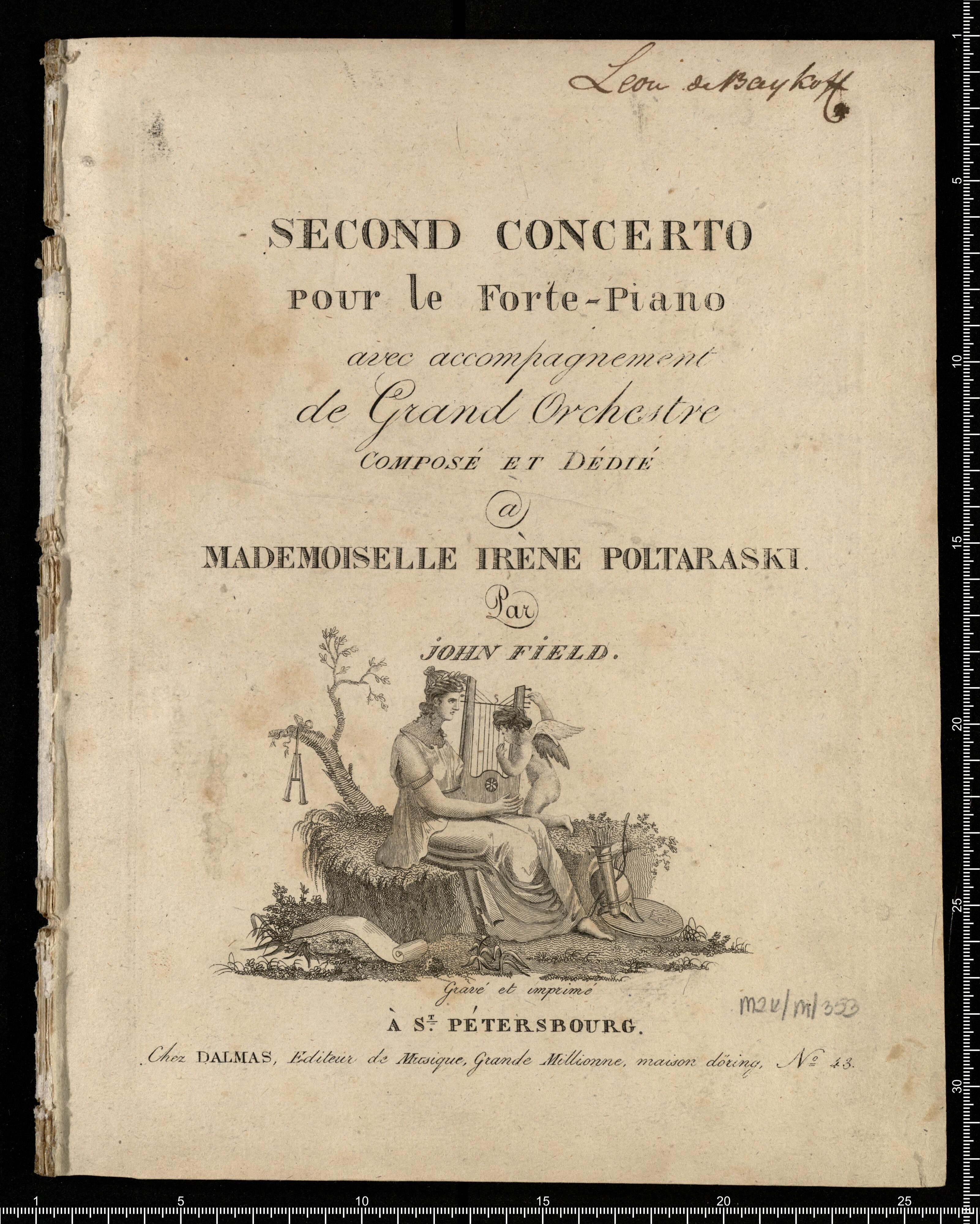 [handwritten:] Leon de Baykoff | SECOND CONCERTO | pour le Forte-Piano | avec accompagnement | de Grand Orchestre | COMPOSÉ ET DÉDIÉ | a | MADEMOISELLE IRÈNE POLTARASKI. | Par | JOHN FIELD. | Gravé et imprimé | À S|T PÉTERSBOURG. | Chez DALMAS, Editeur de Musique, Grande Millionne , maison döring, N|o 43