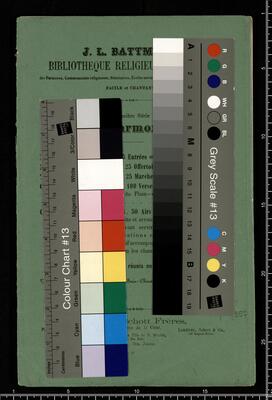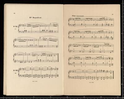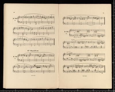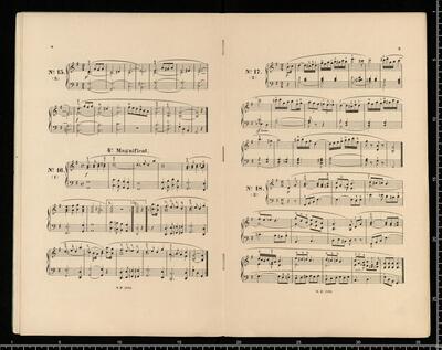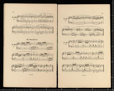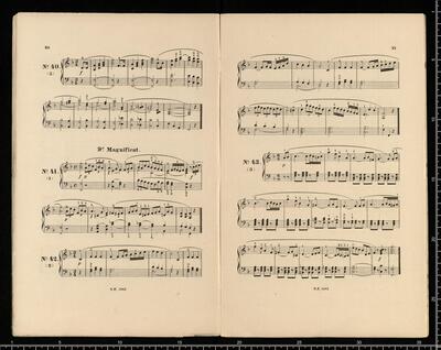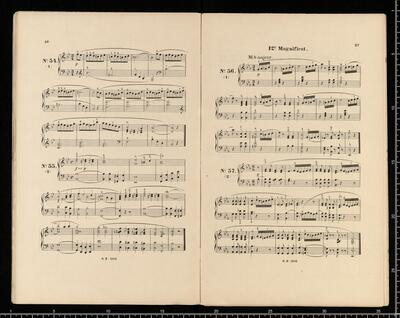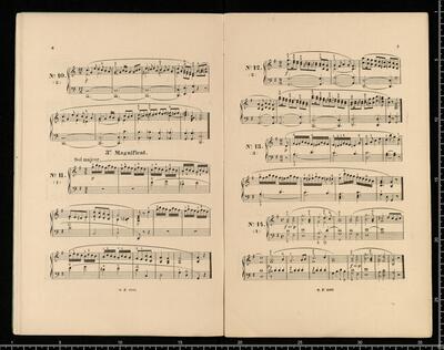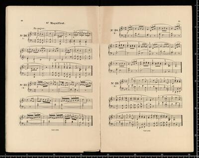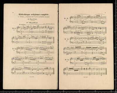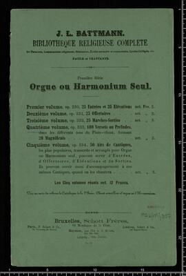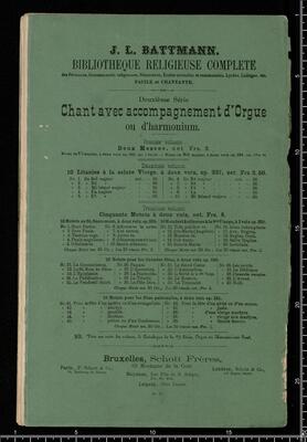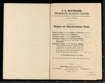 J. L. BATTMANN. | BIBLIOTHRQUE RELIGIEUSE COMPLETE | des Paroisses, Communauté religieuses, Séminaires, Écoles normales et communales, Lycées, Collèges, etc. | FACILE et CHANTANTE. | Première Série | Orgue ou Harmonium Seul. | [price list] | quatrième volume, op. 333, 100 Versets ou Préludes, | dans les differents tons du Plain-chant, formant | 20 Magnificats net.,,3. | [price list] | Bruxelles, Schott Frères, | 82 Montagne de la Cour. | Paris, B. Schott & Co., | 70, Fauburg St. Honori. | Londres, Schott & Co., | 159 Regent Street. | Mayence, Les Fils de B. Schott, | Ent. Sta. Hall. | Leipzig, Otto Junne. | N°. 18, 20 Magnificats org (harmonium)