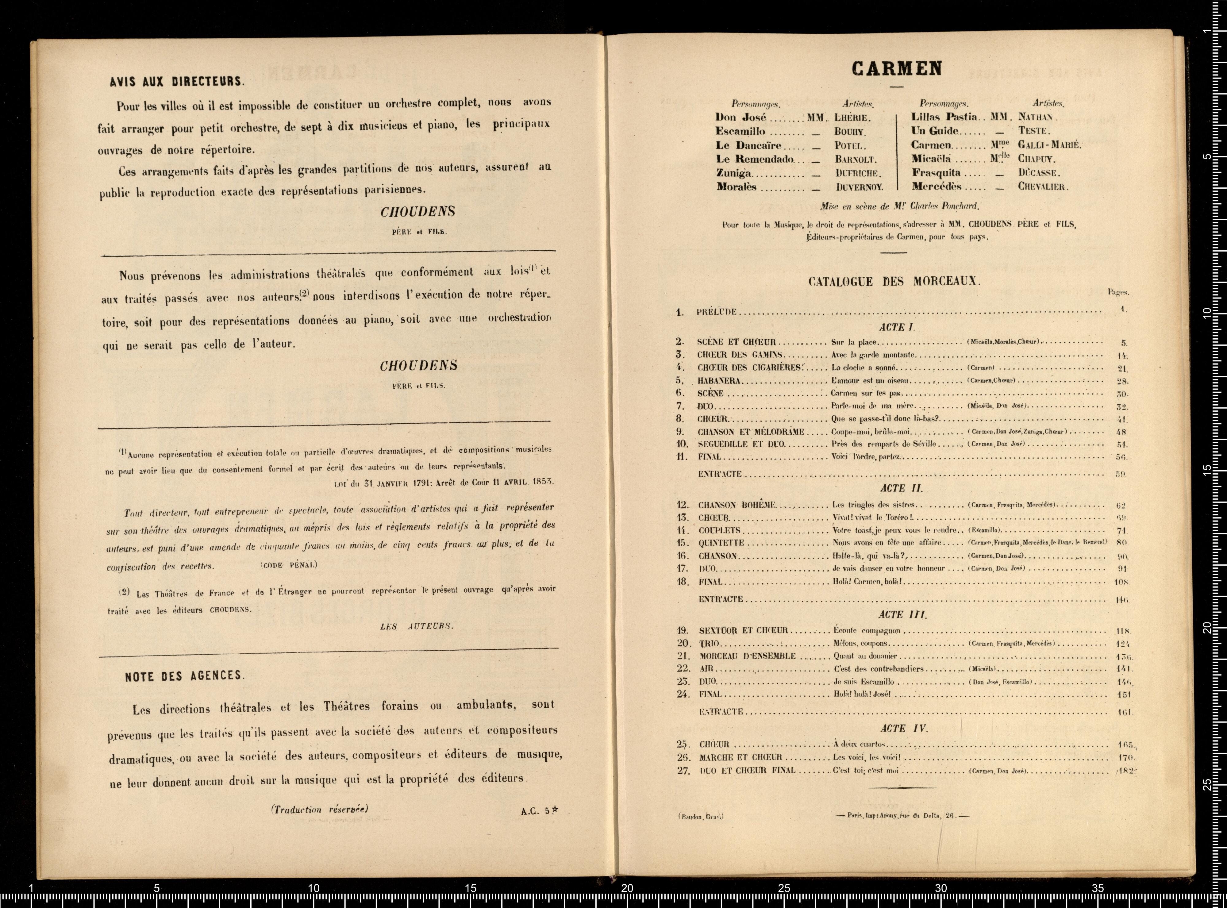 à JULES PASDELOUP | CARMEN | Opéra en 4 actes | Ture de la nouvelle | DE | PROSPER MÉRIMÉE | Poéme de | H. MEILHAC et L. HALÉVY. | Musique de | GEORGES BIZET | Paris, CHOUDENS Père & Fils, Editeurs, | 265, Rue S|t Honoré, (Près l'Assomption) | Propriété pour tous pays. | Droits réservés | Imp. Fouquet, Paris. | PARTITION, Piano Solo arrangée par Antony CHOUDENS