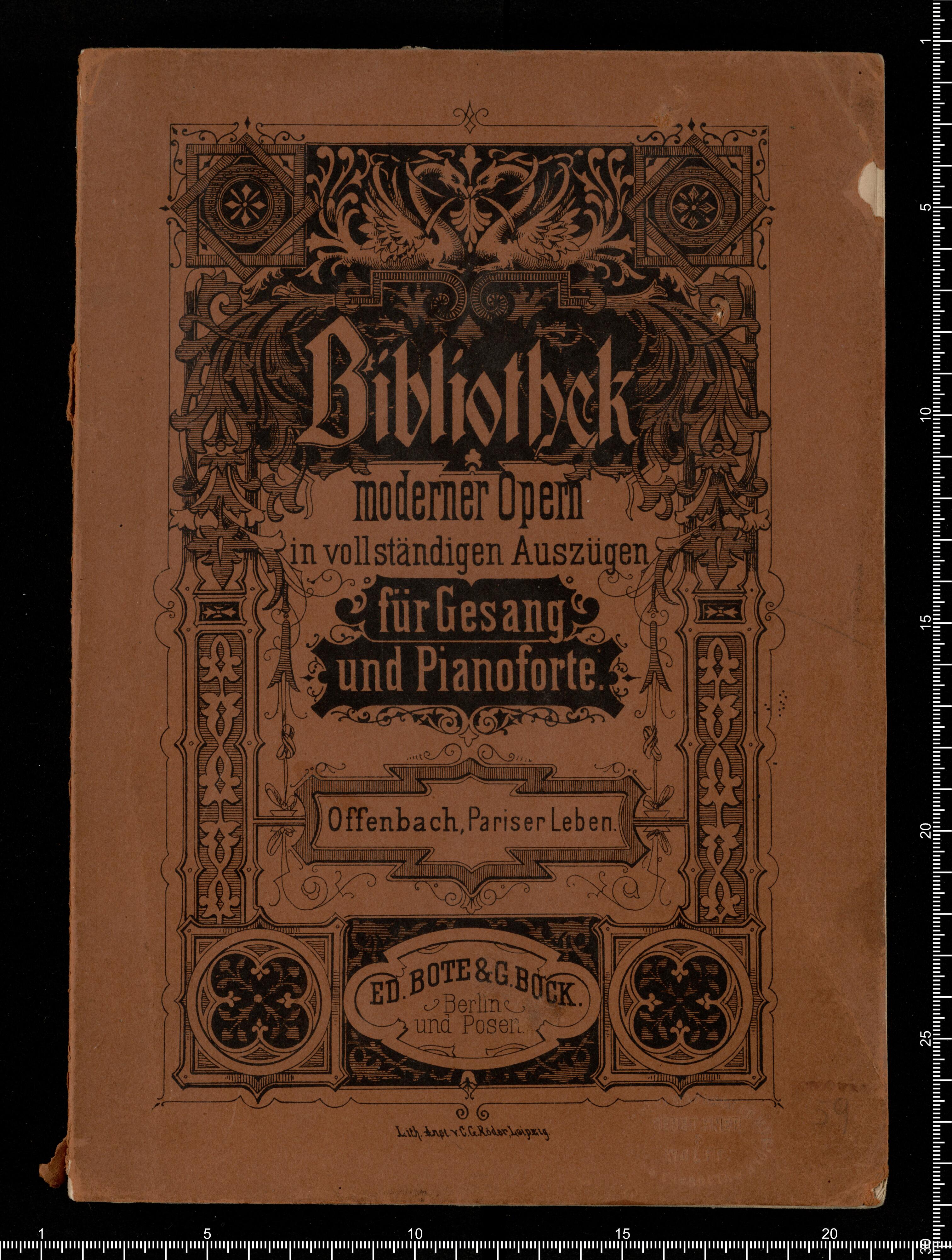 Biblithek | moderner Opern | im vollständigen Auszügen | für Gesang | und Pianoforte. | Offenbach, Pariser Leben. | ED.BOTE&G.BOCK. | Berlin | und Posen. | Lith. Anst. v. C.G.Röder,Leipzig