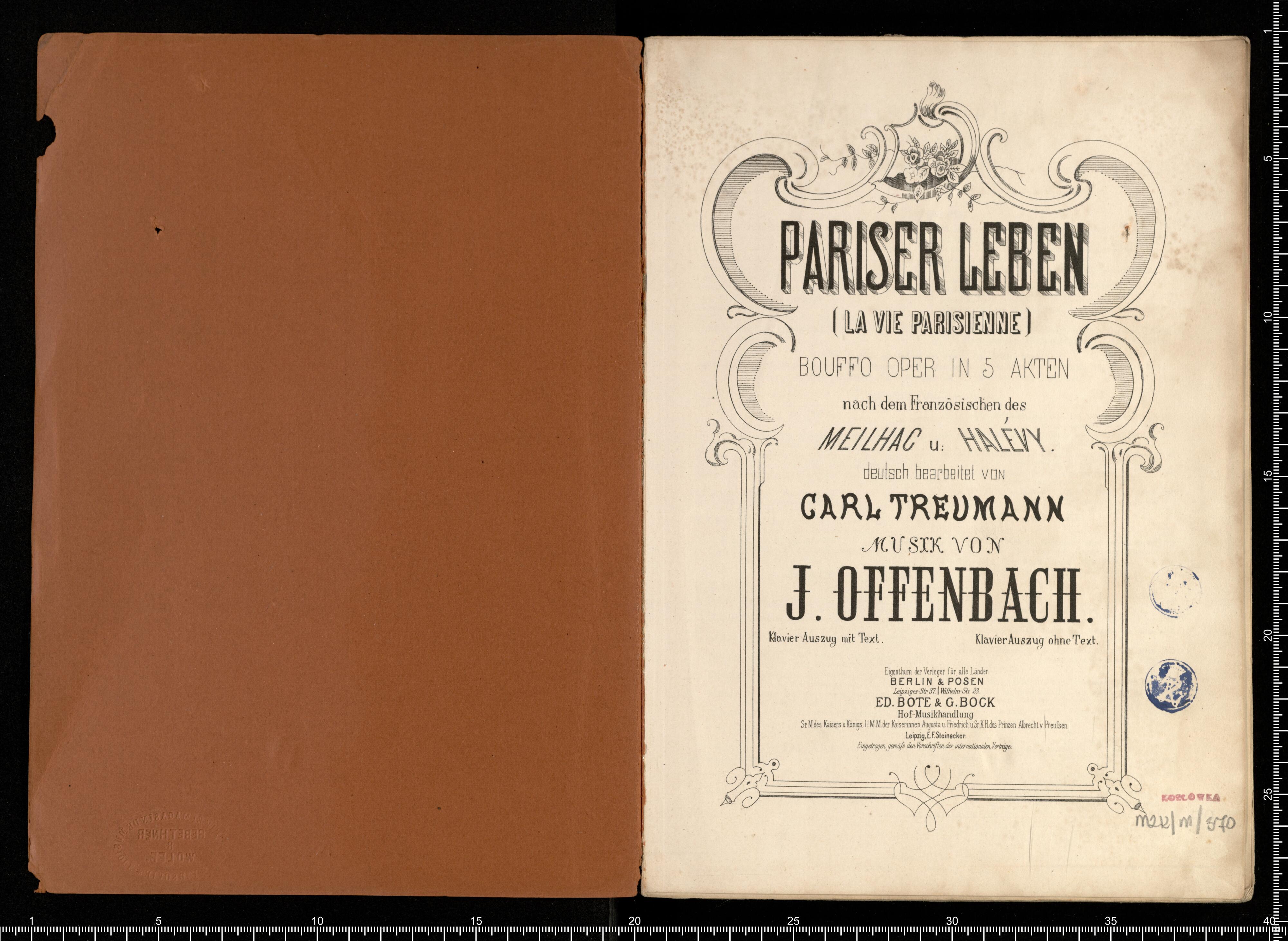 Biblithek | moderner Opern | im vollständigen Auszügen | für Gesang | und Pianoforte. | Offenbach, Pariser Leben. | ED.BOTE&G.BOCK. | Berlin | und Posen. | Lith. Anst. v. C.G.Röder,Leipzig