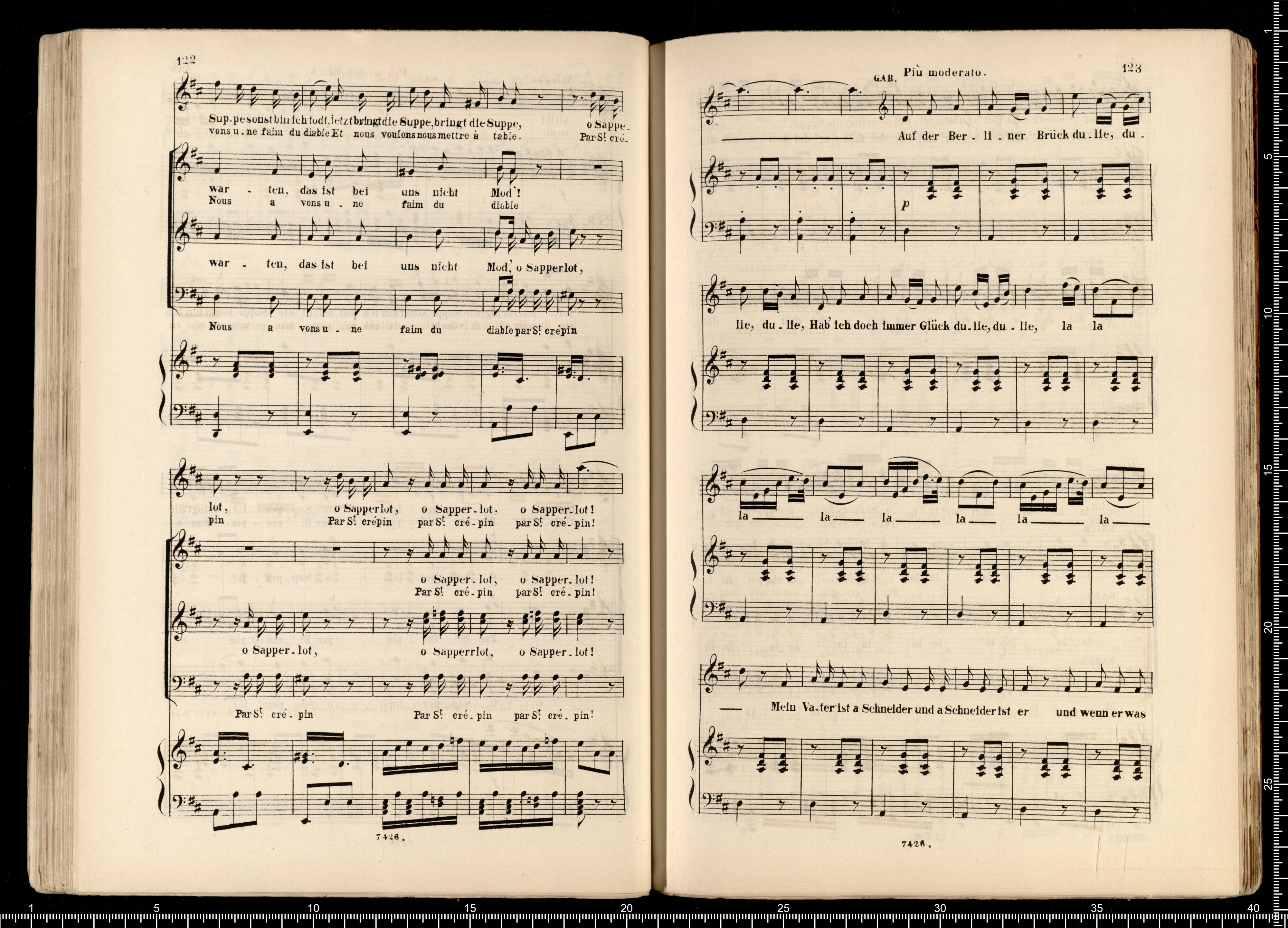 Biblithek | moderner Opern | im vollständigen Auszügen | für Gesang | und Pianoforte. | Offenbach, Pariser Leben. | ED.BOTE&G.BOCK. | Berlin | und Posen. | Lith. Anst. v. C.G.Röder,Leipzig