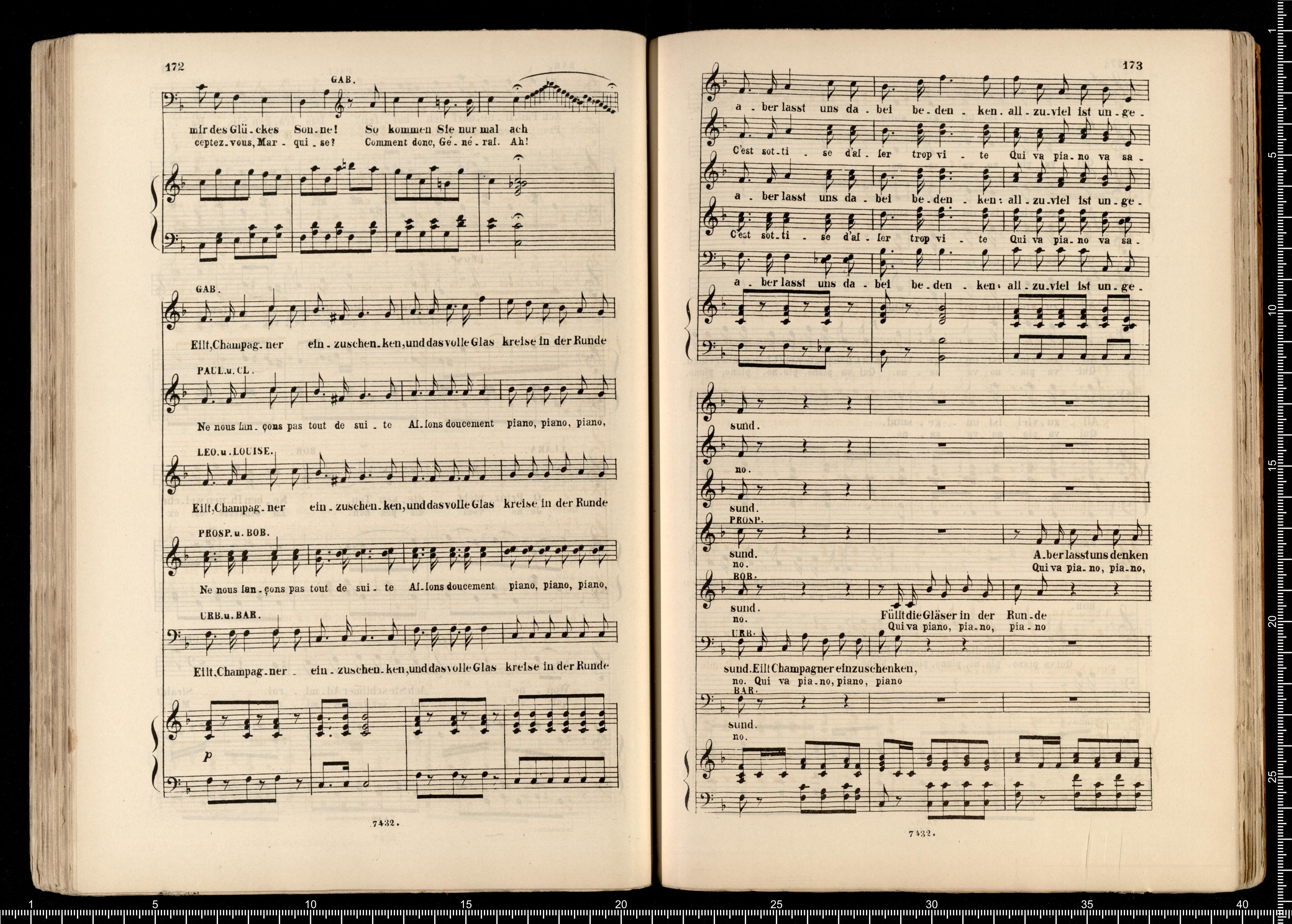 Biblithek | moderner Opern | im vollständigen Auszügen | für Gesang | und Pianoforte. | Offenbach, Pariser Leben. | ED.BOTE&G.BOCK. | Berlin | und Posen. | Lith. Anst. v. C.G.Röder,Leipzig