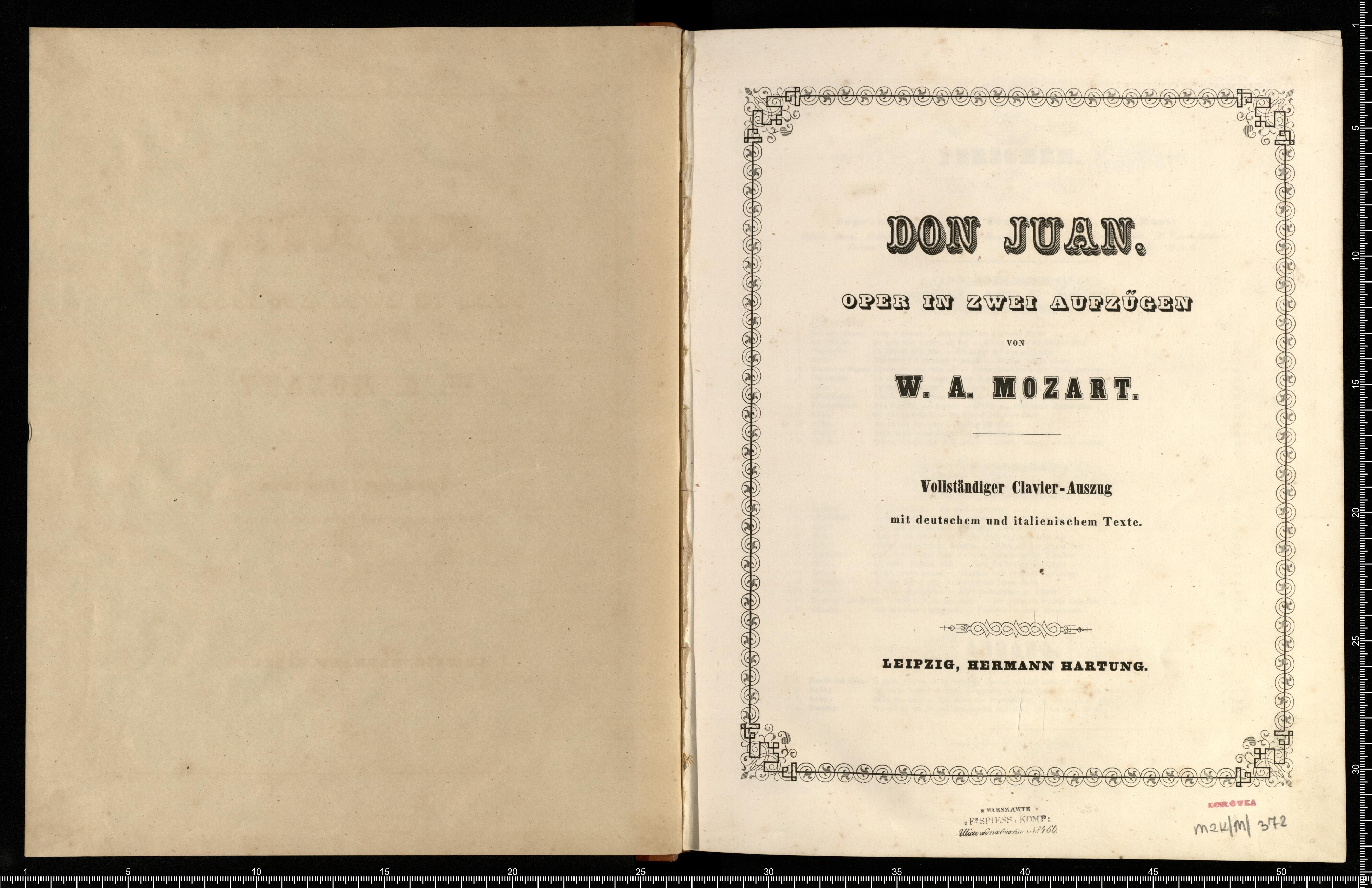 Don Juan. Oper in zwei Aufzügen von W. A. Mozart. Vollständiger Clavier-Auszug mit deutschem und italienischem Texte [Leipzig, Hermann Hartung]